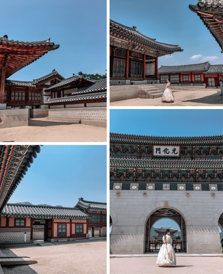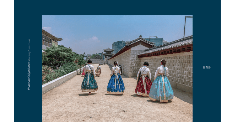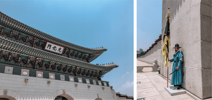 光化門前 湛藍的晴天下 城門佇立著身著青衣 左持彎刀 右扶大旗的侍衛