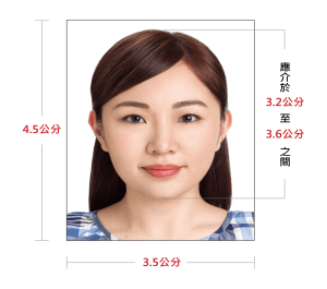 2. 六個月內白底彩色照 2 張。(不含邊框,直須 4.5cm/橫 3.5cm,半身、正面、脫帽、五官清晰、露耳不露齒,白色光面照片,照片中人像自頭頂至下顎之長度不得小於 3.2cm 超過 3.6cm,如配戴眼鏡不得遮蓋眼睛任一部位,不得使用合成照片)