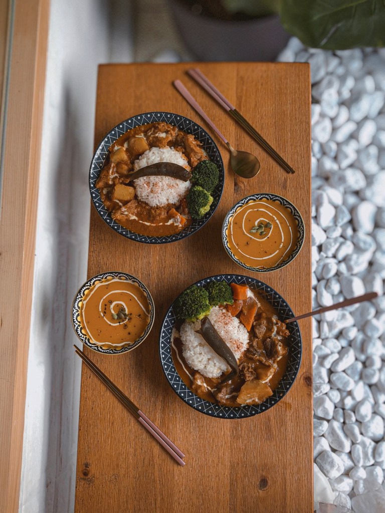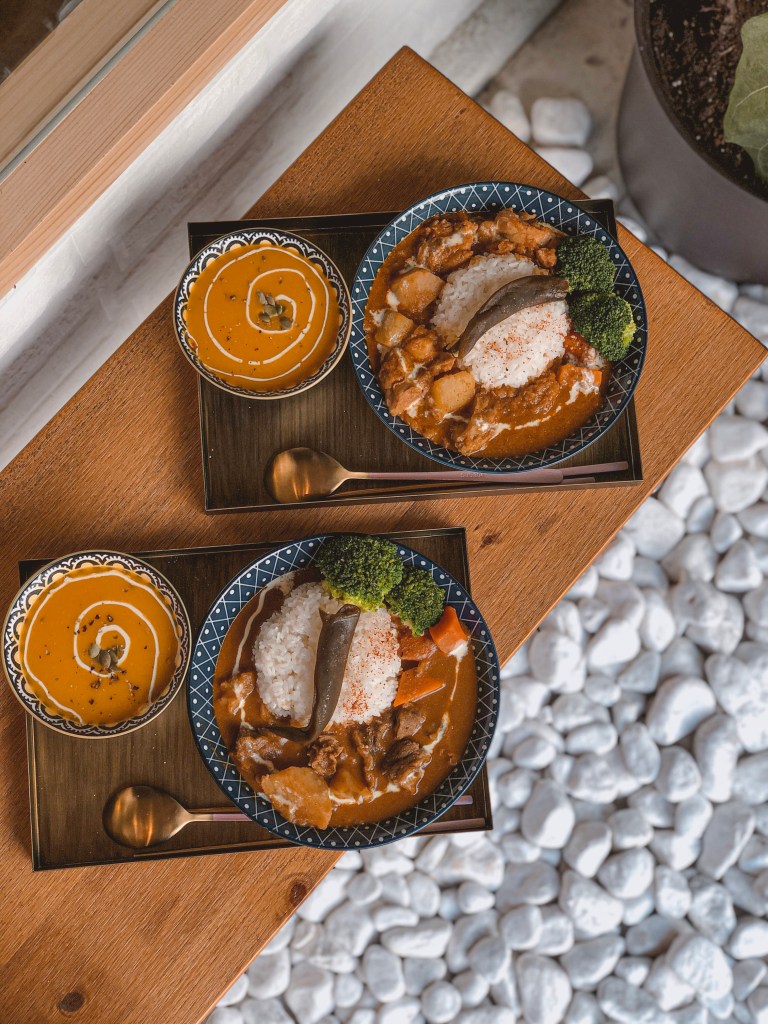 sansan和同事各來一種口味的咖喱飯:來時雞肉香料咖喱飯($190)和 來時牛肉香料咖喱飯($220)。咖喱飯都有附上一碗看起來超濃郁的南瓜濃湯~喜歡南瓜的sansan覺得這種組合超棒的!