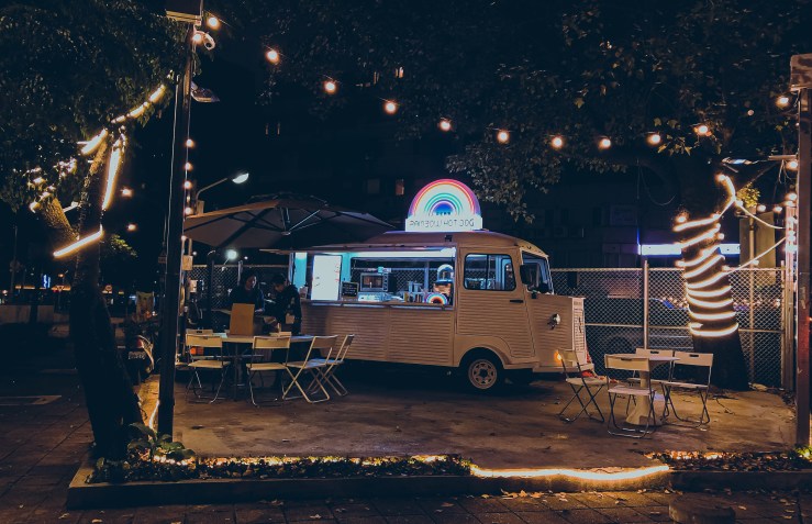 頂著一個霓虹彩虹造型燈的餐車佇立在光復南路上,周圍掛起浪漫的燈串,在樹上圍著一圈一圈閃閃發亮的燈條,在晚上暖暖發光好像在對我招手一直讓我過去~