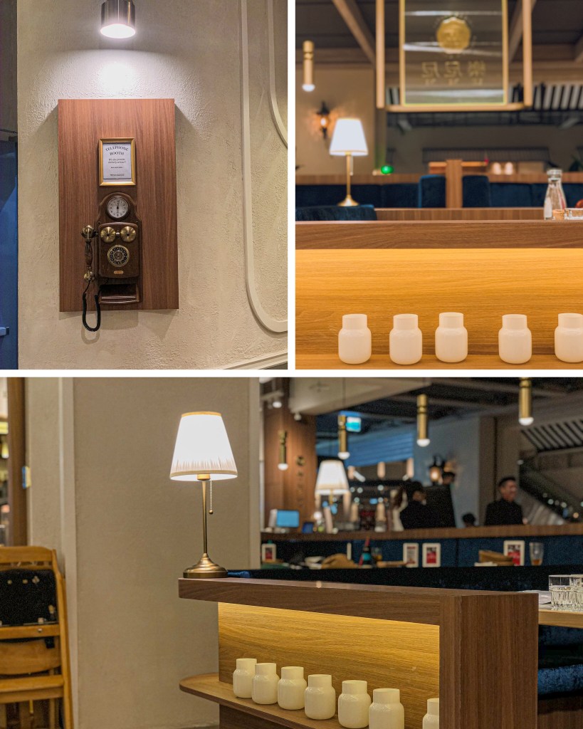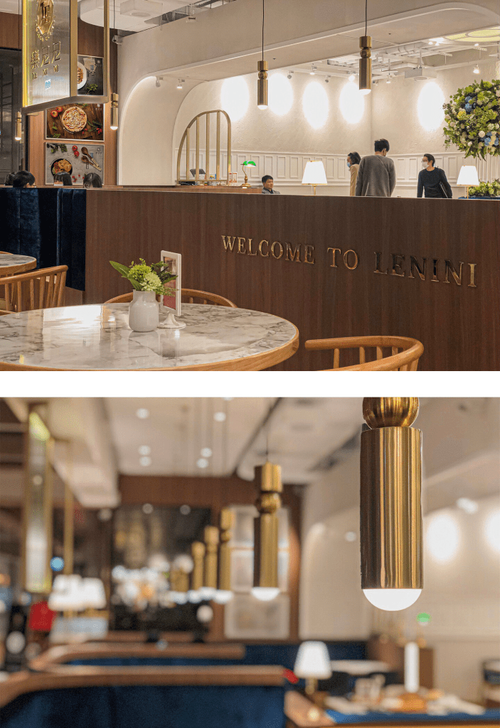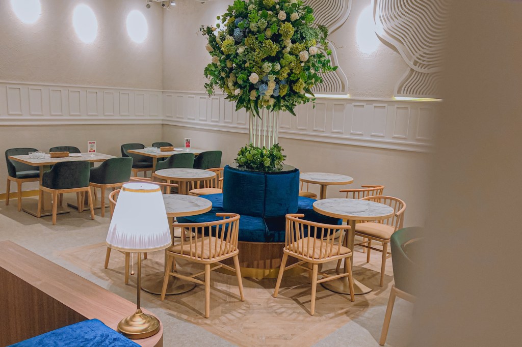 ▲ 沿襲巴洛克風格華麗、戲劇性的用色以及追求曲線及裝飾的風格,二代店用色採用飽和的靛藍與墨綠搭配金黃色裝燈具,營造飽滿的視覺與莊重霸氣感!大量的暖白色牆面及穿插其中的木質傢俱,增添優雅舒適的空間層次感!