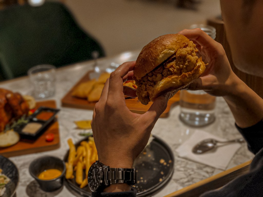 第二個主餐選擇了sansan和同行友人的共同必點名單『花生醬酥炸雞腿堡』,花生醬和漢堡就是不容反駁的美食霸主,每看必點!!厚實的 6盎司卡啦雞腿 超有份量,夾在烤的江江好的麵包裡,太吸睛拉~~漢堡的生菜可依個人喜好自由搭配,炸的金黃的薯條配上起司沾醬,口口允指回香!