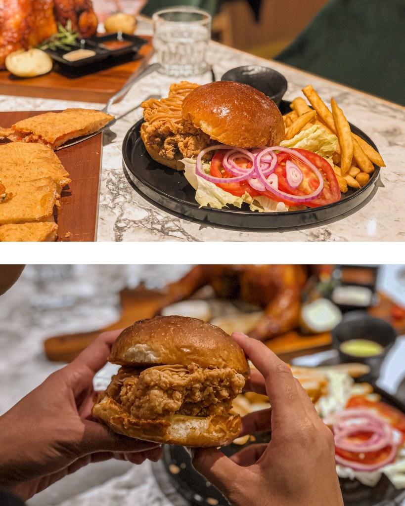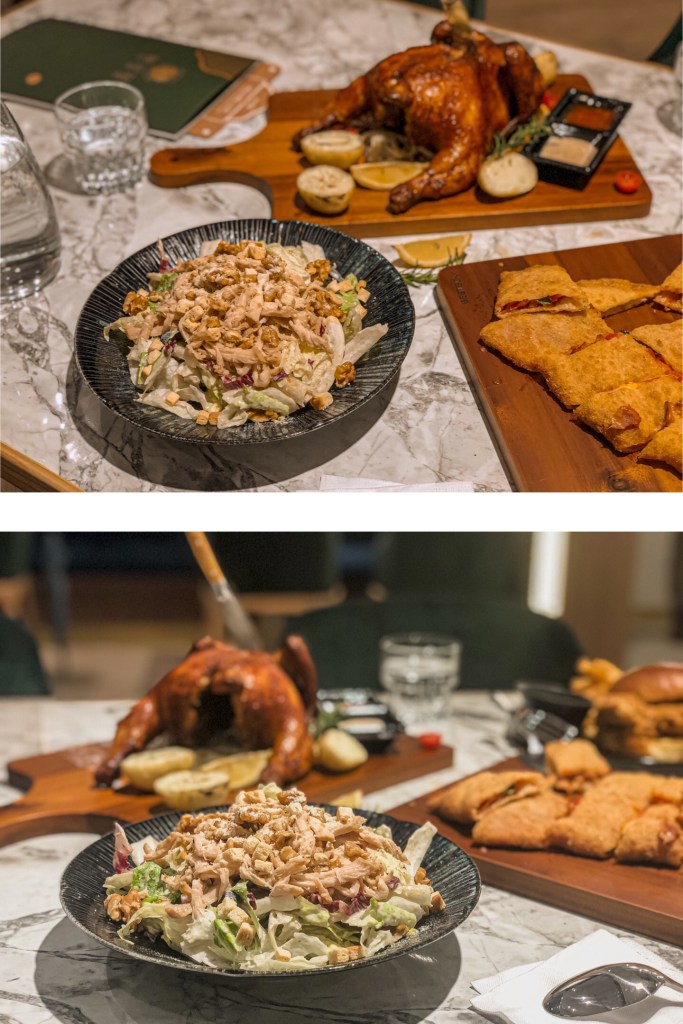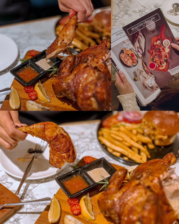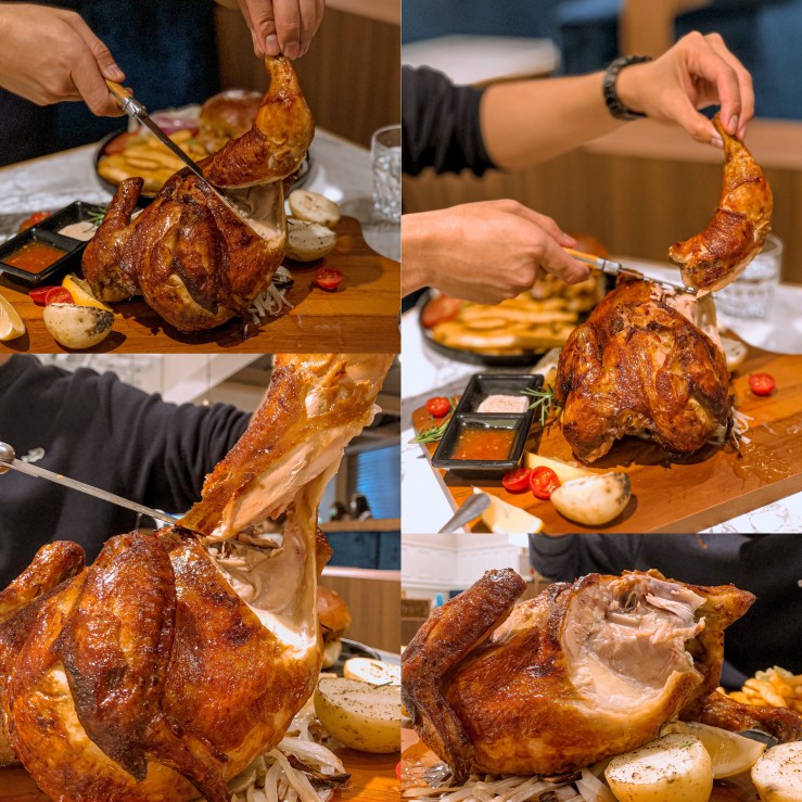 ▲ 一刀切下!鮮嫩的肉汁就流下來了~烤雞的香氣瞬間飄升,整桌充滿迷迭香與雞肉的香氣,擠上清爽的檸檬汁更激發食慾!(流口水)