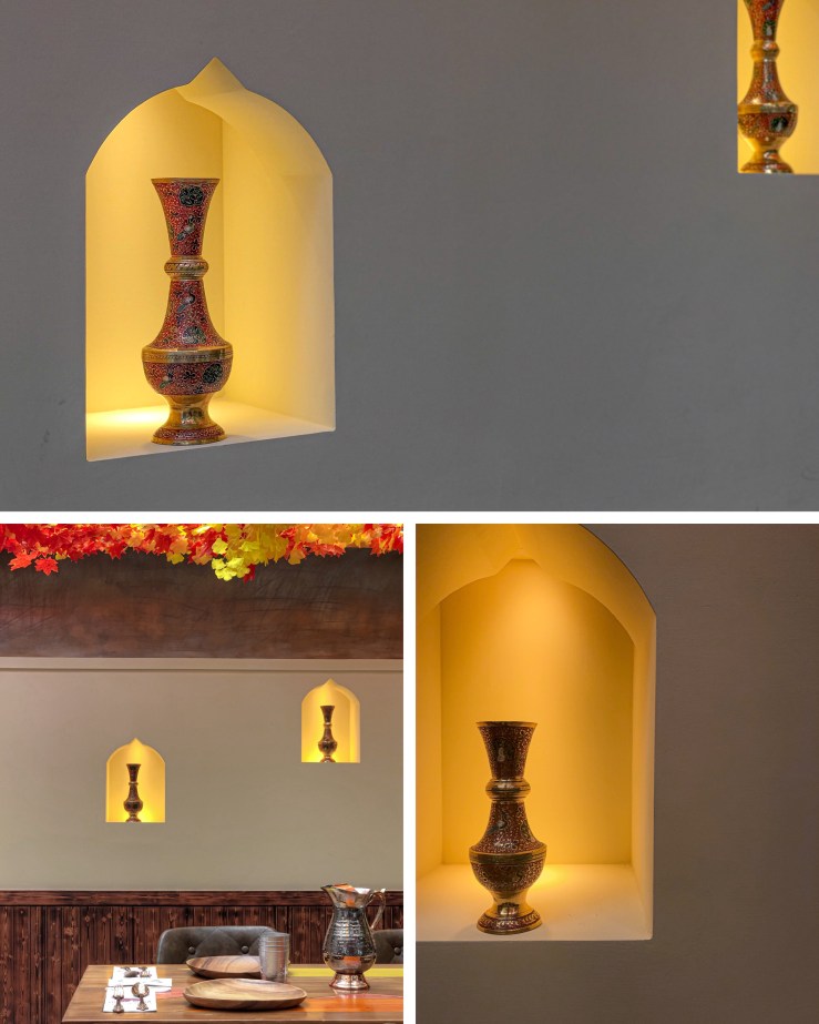 除了佈置滿繽紛色彩的透明天花板外,室內擺設上使用了許多印度文化元素:布幔、掛畫、寶來屋電影海報以及色彩鮮明的用色,印度生意盎然、充滿熱情的風情嶄露無遺,絕對會讓喜愛小細節的朋友感受到非常棒的用餐體驗~