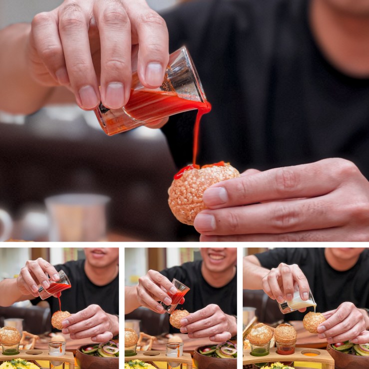 印渡風情 在醬汁上做了新的創意,我們可以自己添加並調配喜歡的比例!紅(番茄醬) 白(酸奶) 綠(薄荷)的醬汁依次倒入小酥球中,一口咬下,外皮脆脆的瞬間碎裂,所有醬汁也沿著手爆了出來(笑),味道本身倒不是很大的重點了,其中的趣味更讓人覺得新奇與享受~