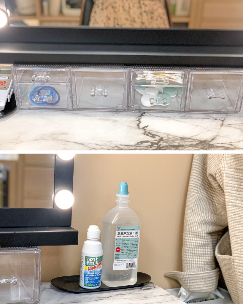 ▲ 貼心的梳妝台應有盡有,洗眼液、保養液、隱眼盒、髮圈、棉花棒、梳子、吹風機等等,細心入微的替客人準備周全~
