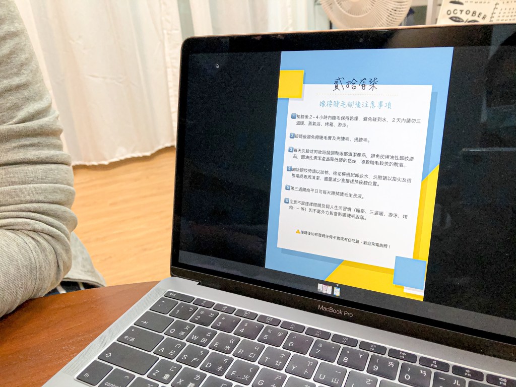 ▲ 填寫完基本資料後闆娘就開始向第一次接睫的sansan做介紹:該如何保養?睫毛的排列方式、長短、捲翹度等。最後在闆娘專業的推薦下,sansan選擇了自然又有神的『日式接法140根』方案