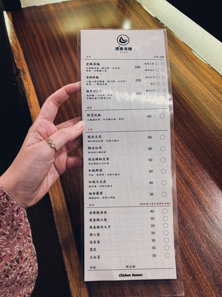 麵食主義的sansan不論乾麵或湯麵都非常熱愛,和友人初次到訪,就各點了一乾一湯的老雞拉麵品嚐經典的招牌主食,湯頭鹹度則依店長推薦選擇正常,還加購了sansan看網友大推的『雞皮仙貝』『剝皮辣椒皮蛋』。