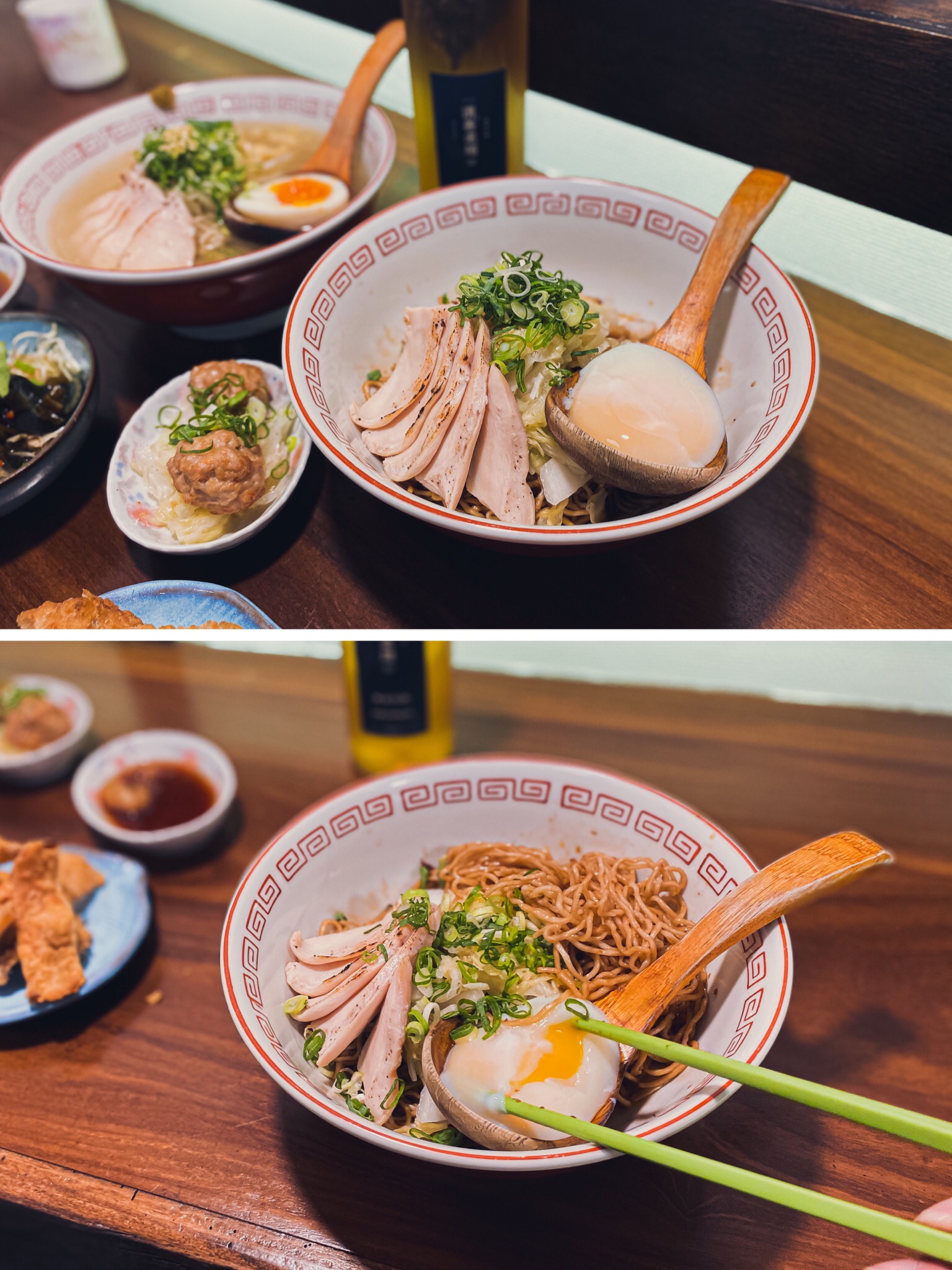 店長推薦先吃原味的老雞拌麵,一入口就帶著麻麻的口感和香氣,嚼幾下後辣味才隨之而來,而辣味不只來自於花椒及青麻椒,還使用了炒過的蒜泥即薑泥提升整體層次,拉麵吸附豐富的麻香與辣度,搭配雞油炒過的大白菜,口味上略勝老雞湯麵一籌!