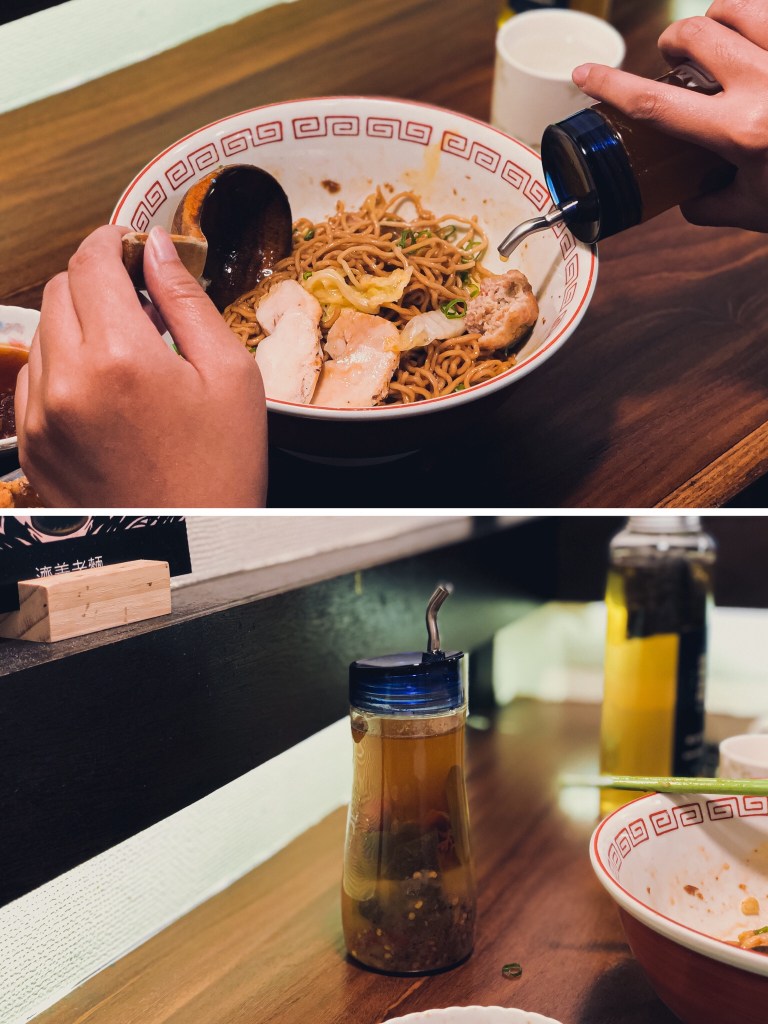 最後加入一點自製的辣油,香氣十足,也不會很辣非常推薦試試!原本不吃辣油的sansan也愛上他們的辣油