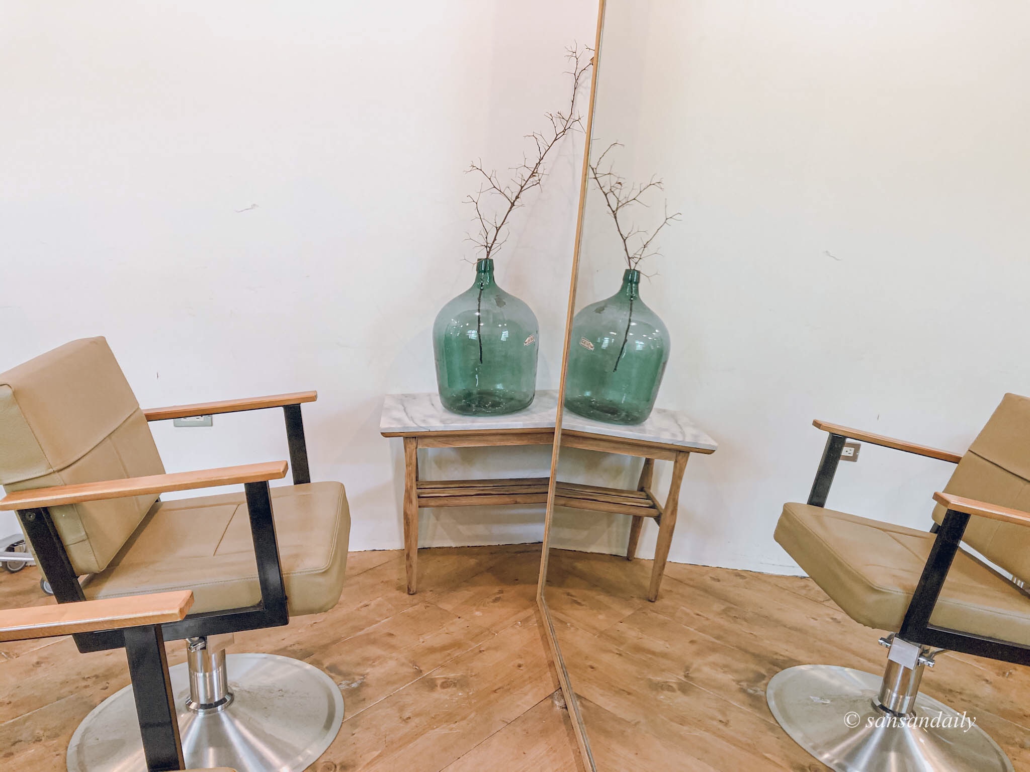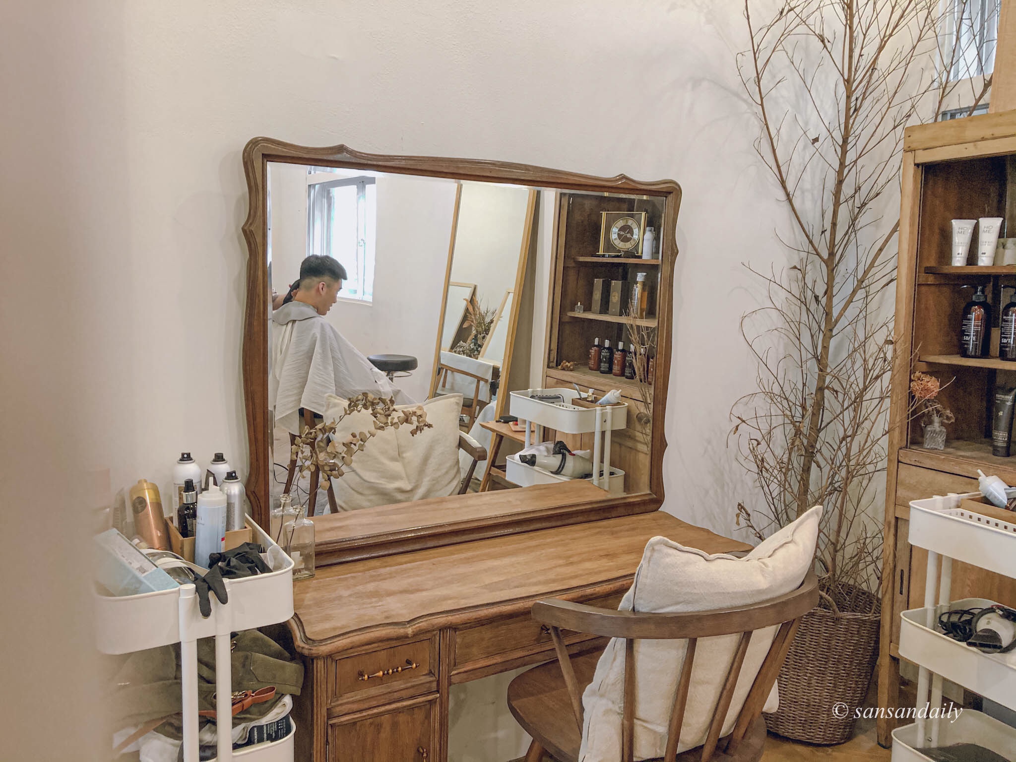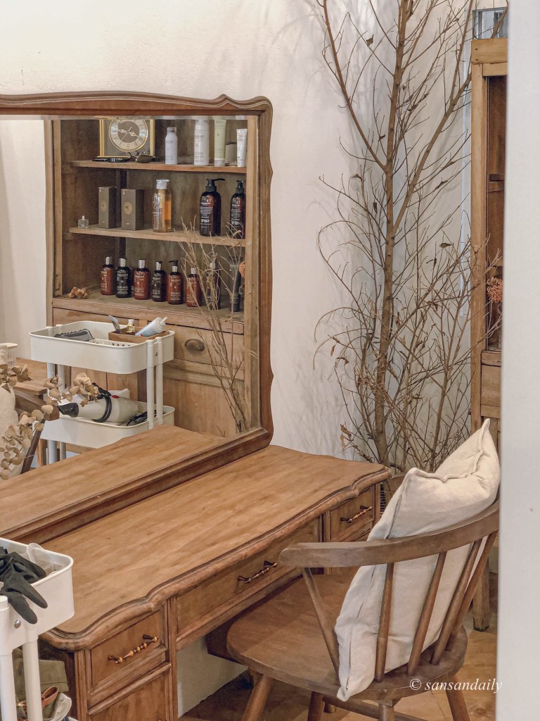這個位子超美!!好希望家裡的梳妝台也長這樣唷~每天都對著鏡子美美的梳頭(笑)想像一下你坐在這裡給設計師用頭髮,是不是頓時有種高級感!好像自己是歐洲莊園裡的貴婦~邊喝著早茶邊準備著一整天美美的造型