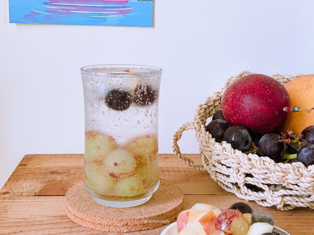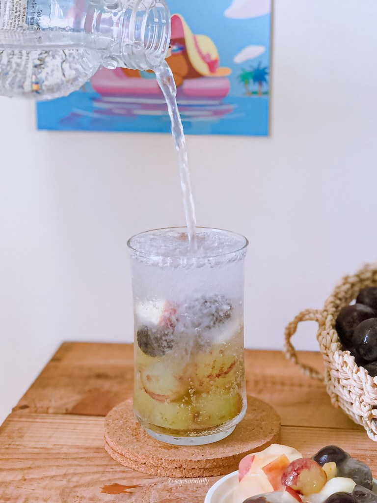最後來打一杯純水氣泡水,sansan本身不太喜歡喝有糖的飲品,氣泡水加水果是最適合我的夏日消暑飲品啦!前一晚先將葡萄去皮冰冷凍製作葡萄冰磚,隔天將純水製作成氣泡水後直接倒入葡萄冰磚中就完成啦!
