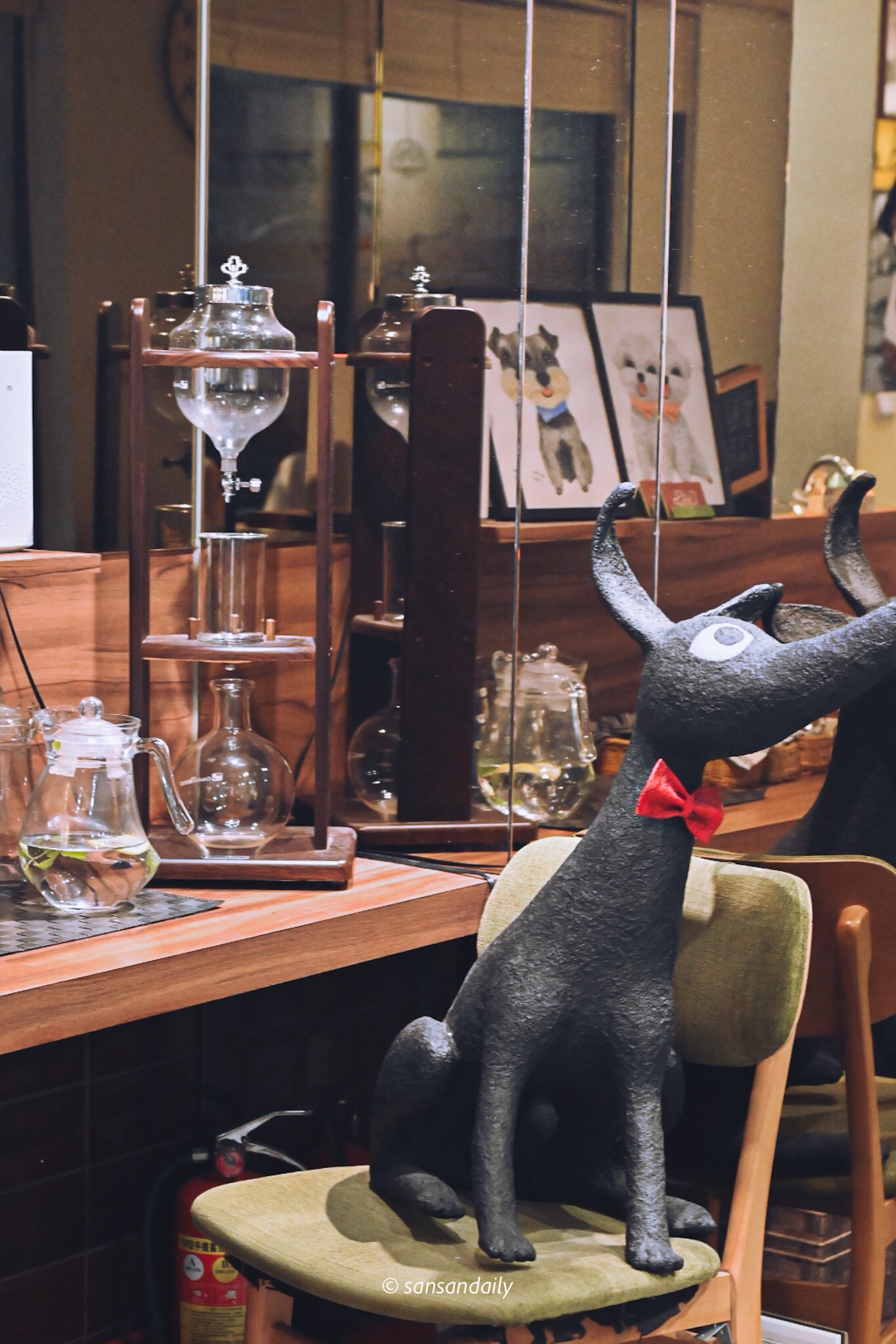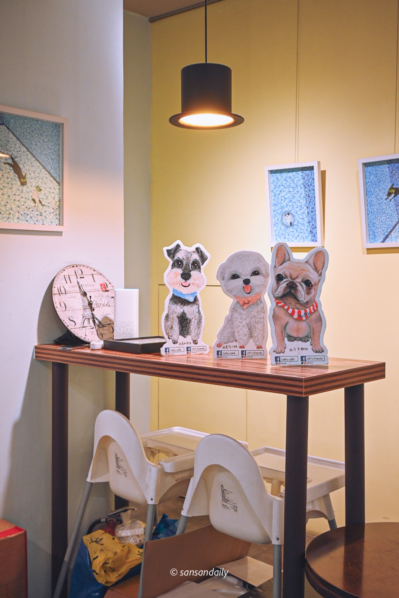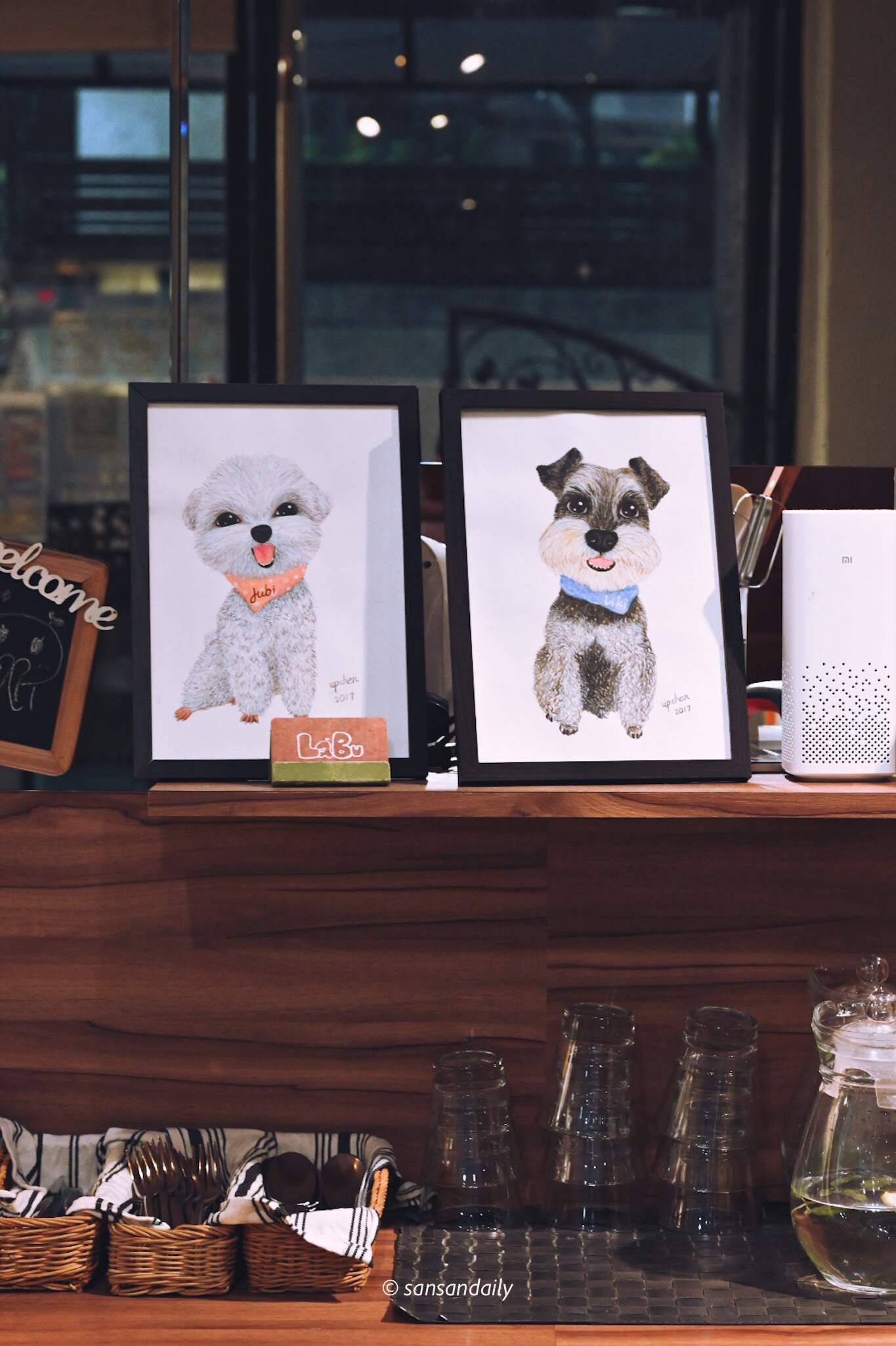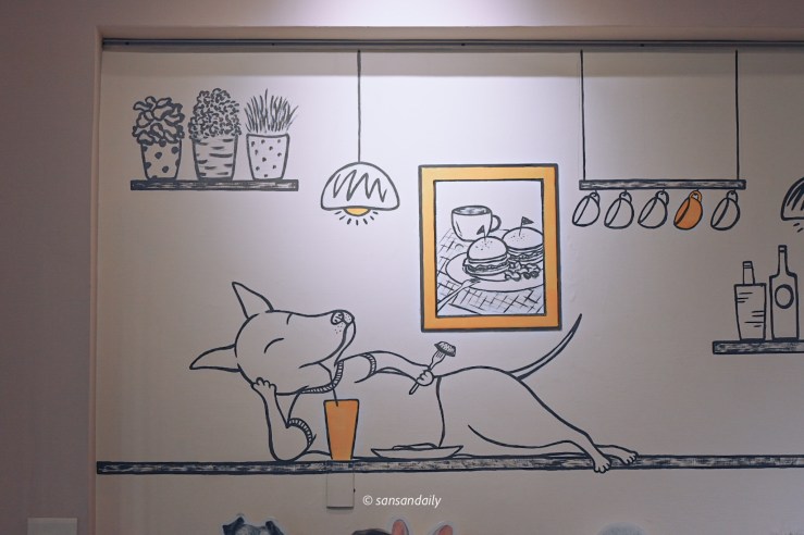 到店內選了角落的沙發座位入座,客人很多但空間上是寬敞舒適的。在倒水的時候裡隨意走動一下,隨處可見可愛的動物壁畫、插圖、公仔等等,處處都有小巧思!
