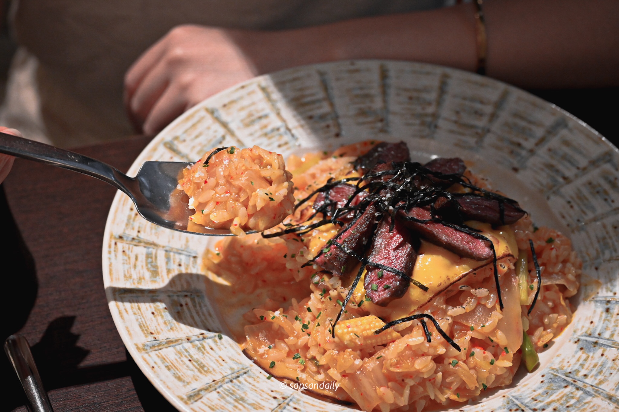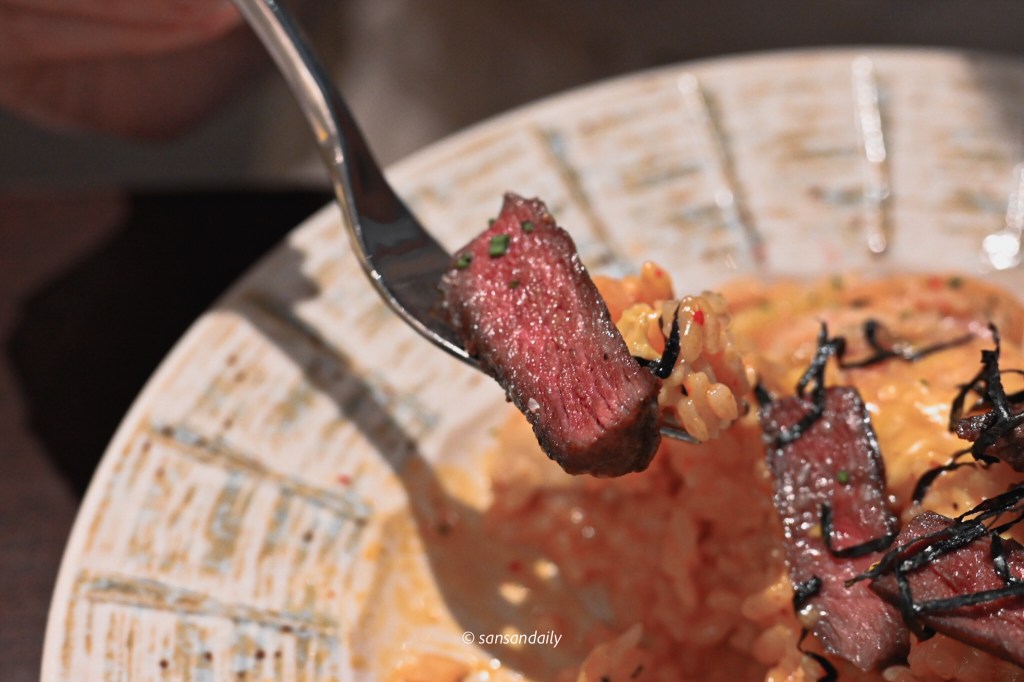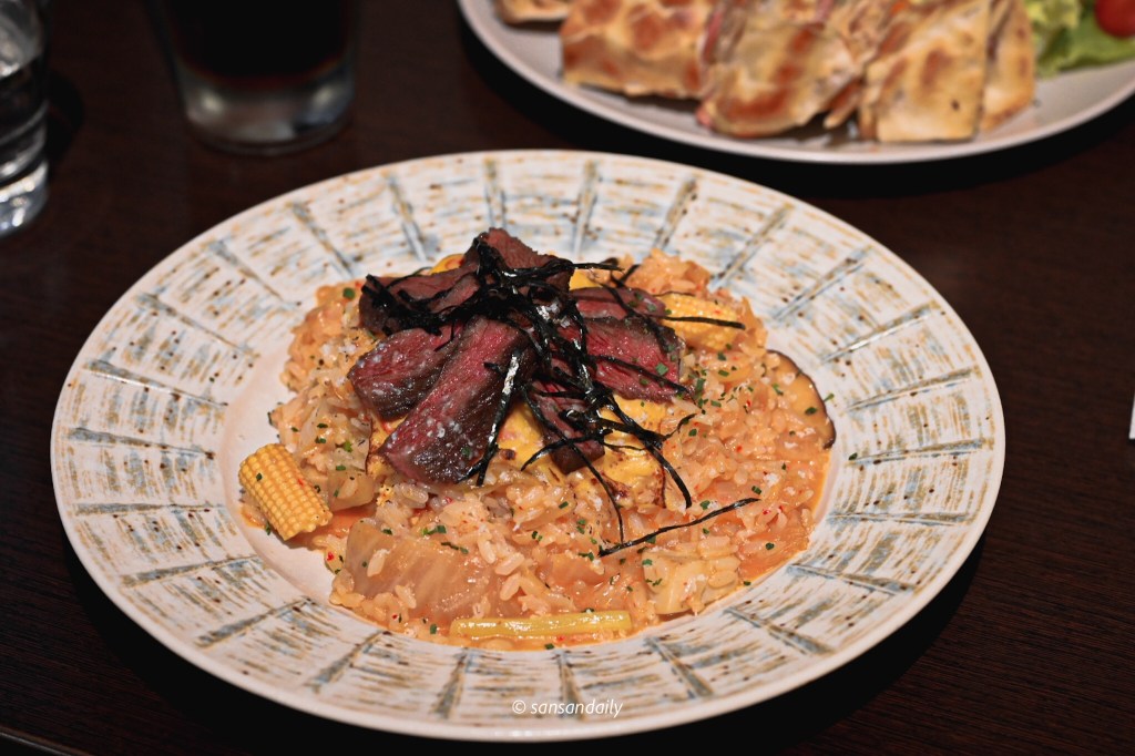 看起來簡簡單單的泡菜燉飯,和起司、海苔攪拌一起入口,米粒被濃郁的醬汁包覆,酸中帶點微辣、微辣中又充滿起司的奶香以及海苔的香氣,表現十分優秀耶,一口接著一口,獲得我倆的一致好評!