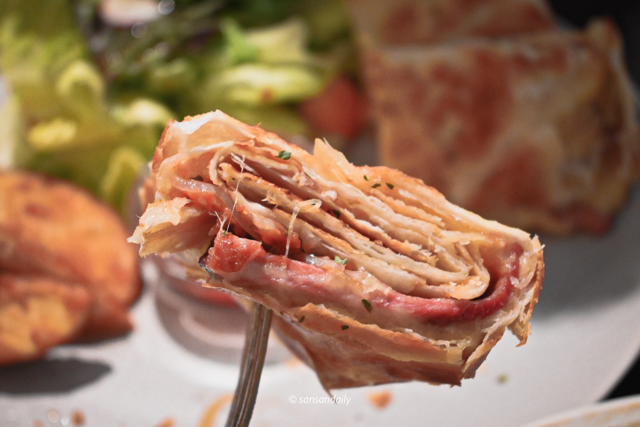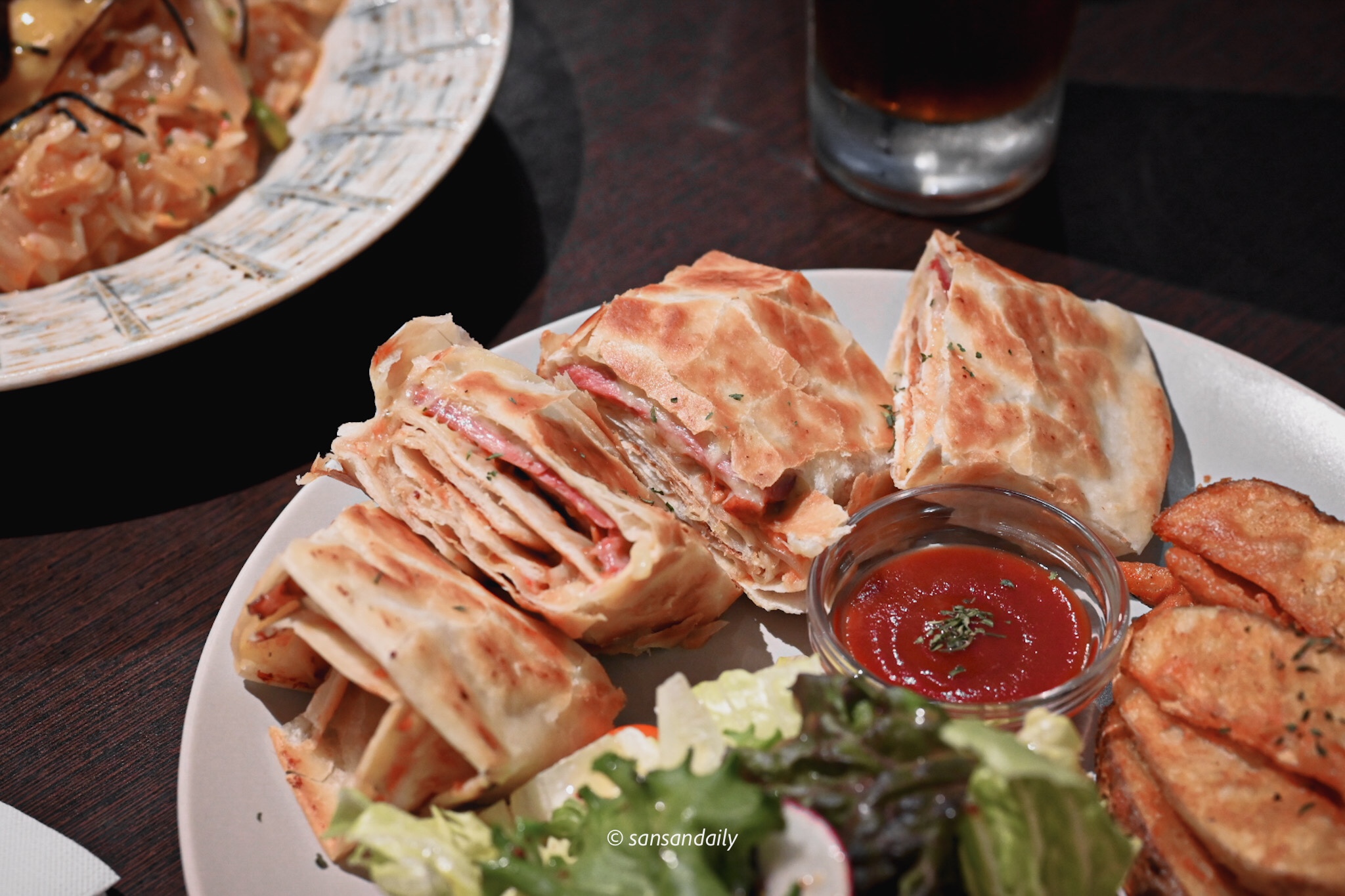 又厚又大份的墨西哥捲餅,中間捲入煙燻鴨胸、起司、洋蔥及青醬,一口咬下酥脆的墨西哥捲餅與紮實的豐富內餡,充滿嚼勁的口感與多層次的風味都相當完美!