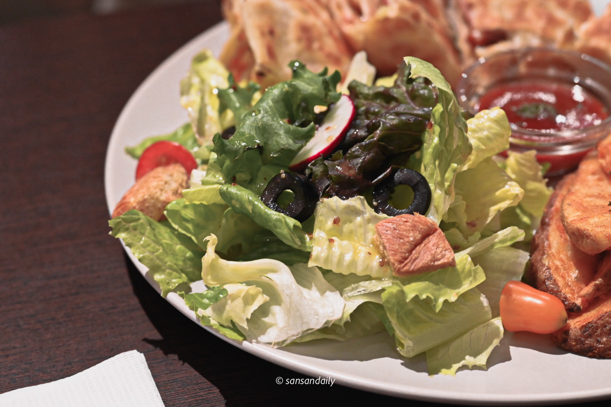 搭配清爽的沙拉和帶皮薯塊,份量扎扎實實。