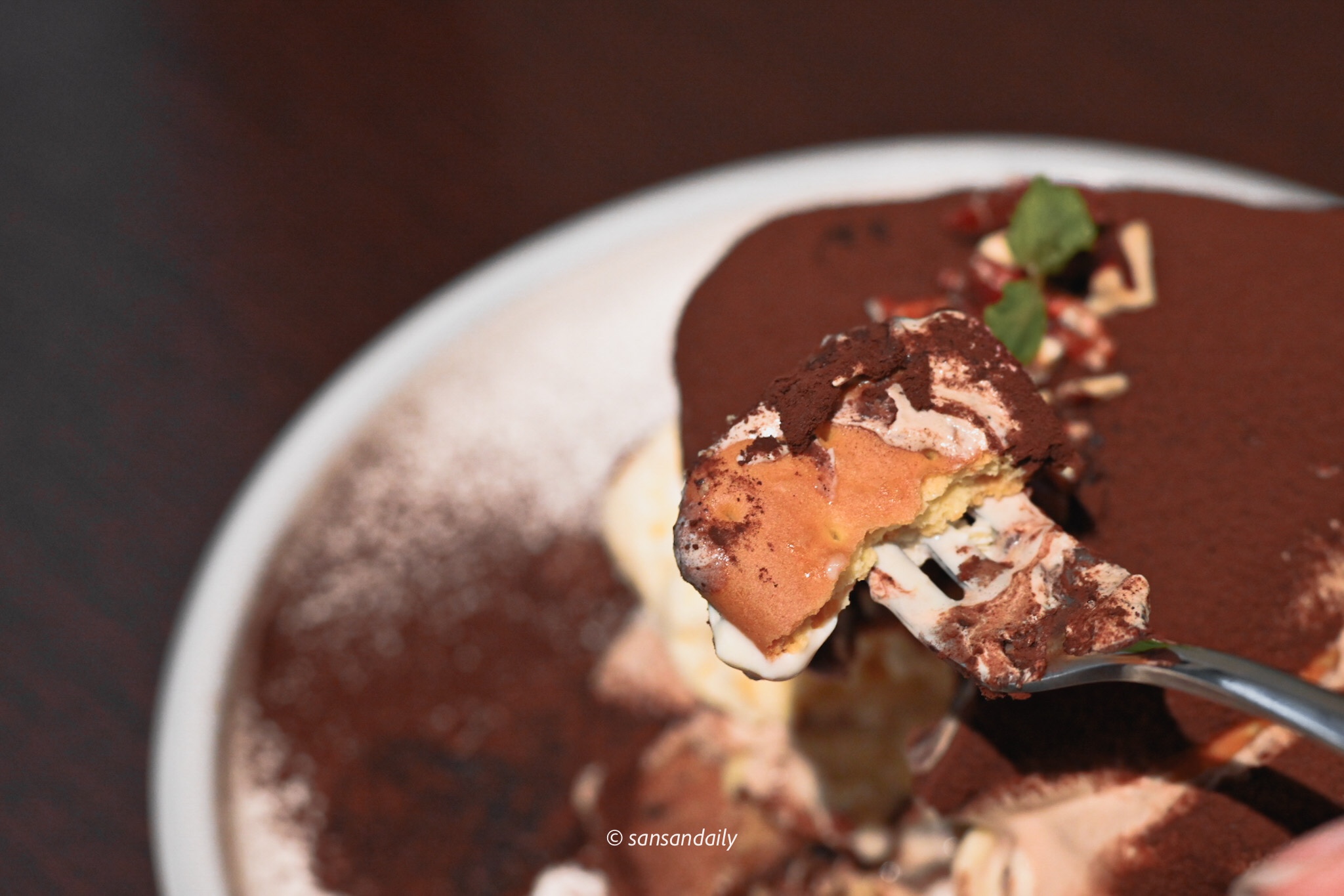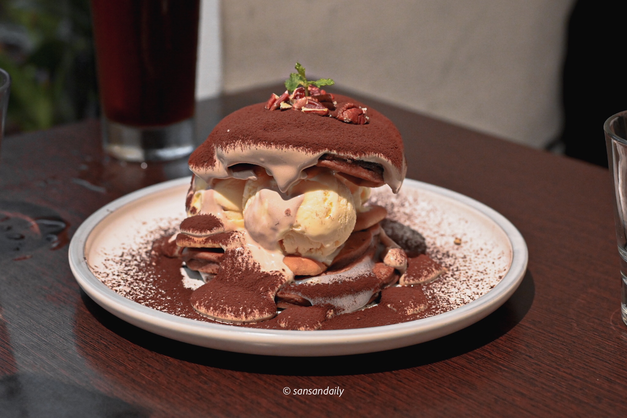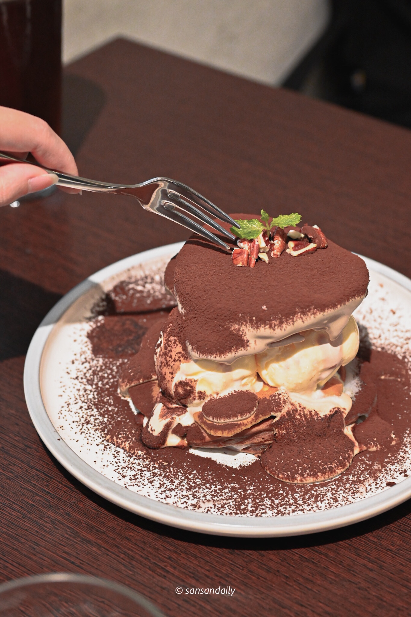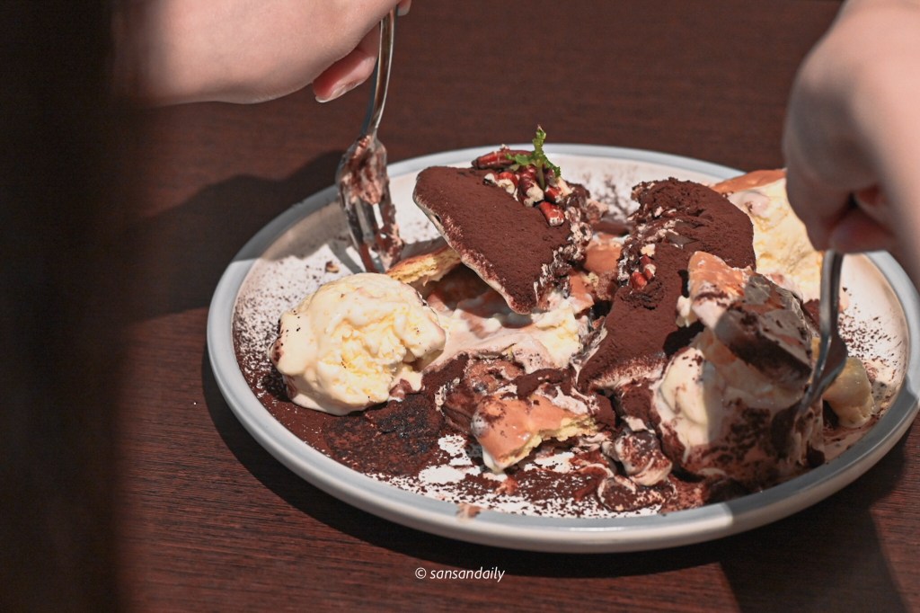 整體口感因為有鬆餅、有冰淇淋、有餅乾還有麻糬,豐富多層次的搭配讓甜點的享受提升到不同境界,尤其是質地柔滑細緻馬斯卡彭起司撒上可可粉,讓一份麻糬鬆餅增添了提拉米蘇的高級滋味。