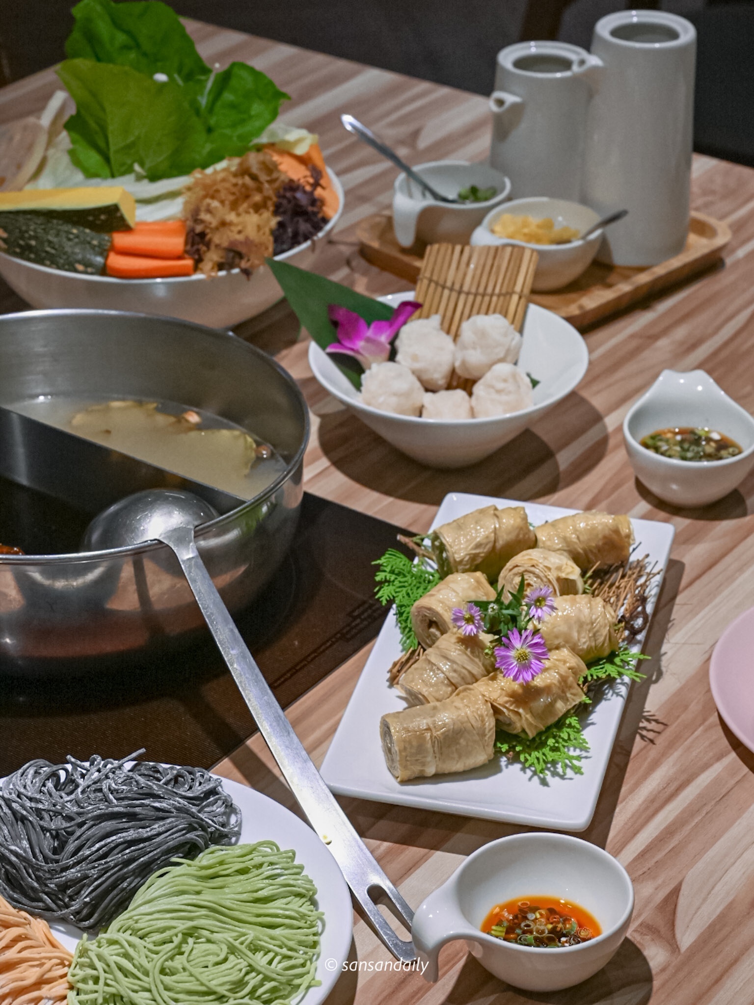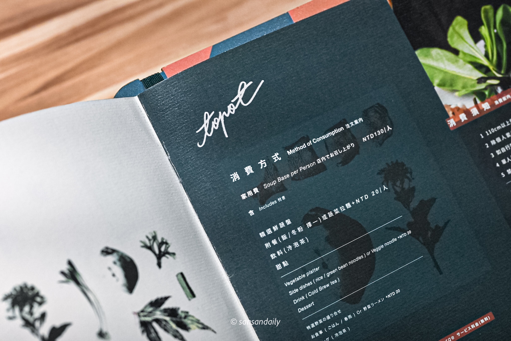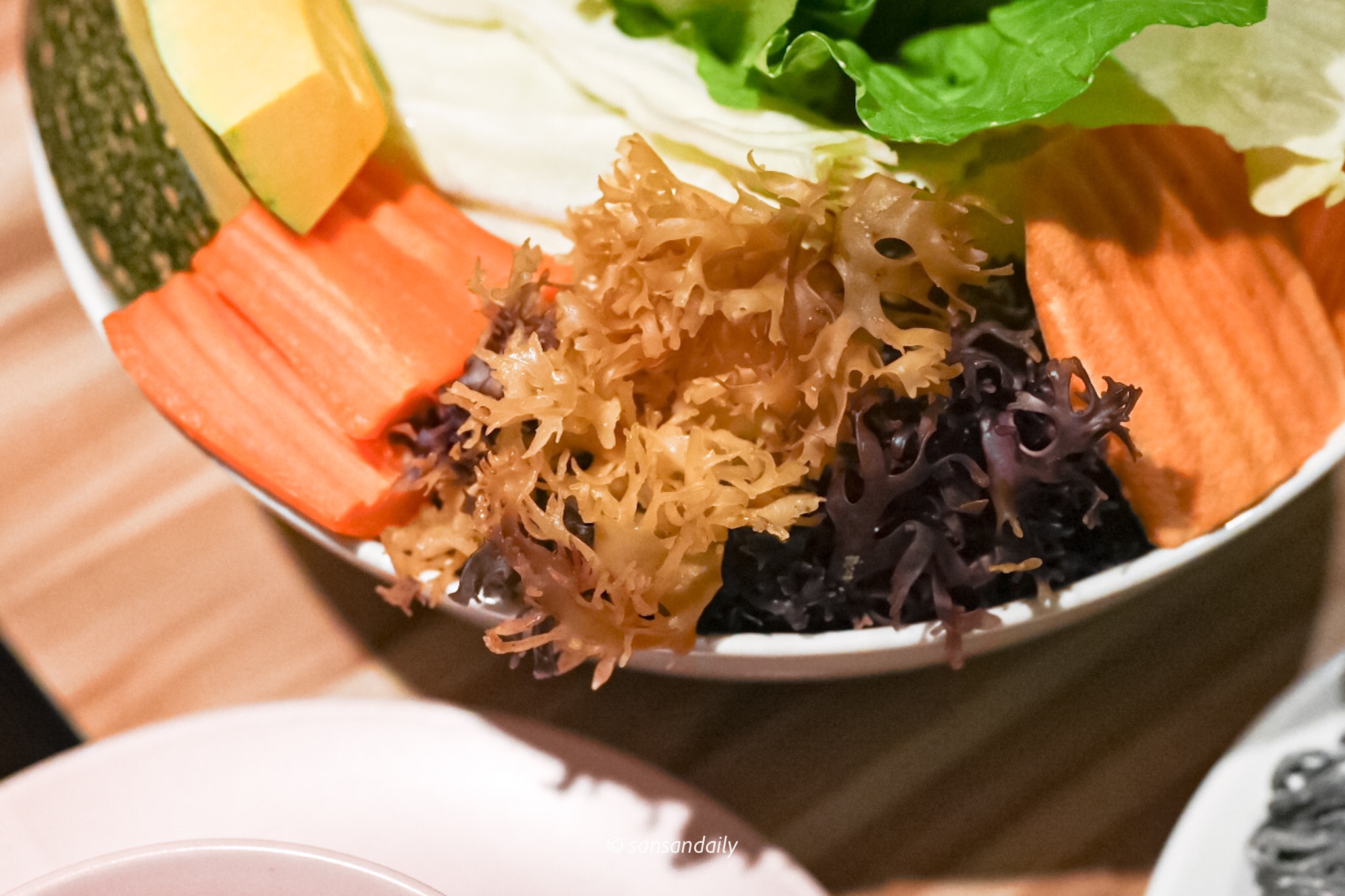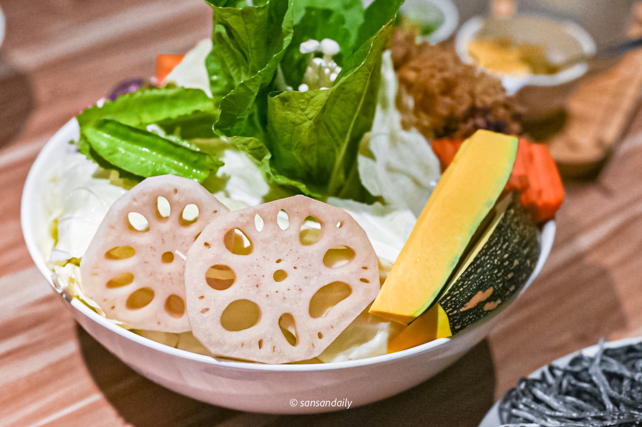 「汆食作伙鍋」的菜盤除了全蔬食、無火鍋料的特色外,搭配的蔬食種類也相當特別,一眼就看到很多長相奇特、樣貌陌生的蔬菜!