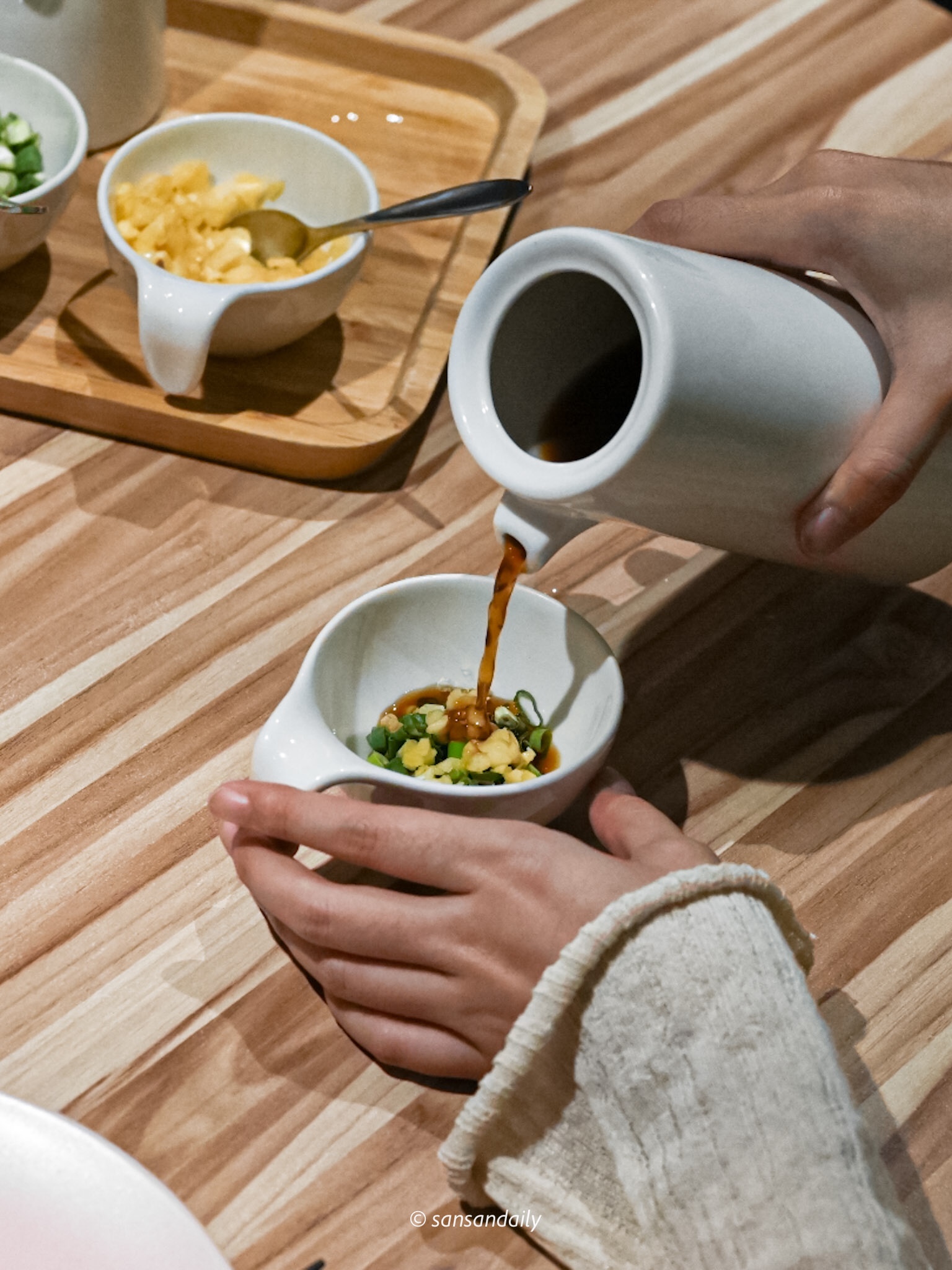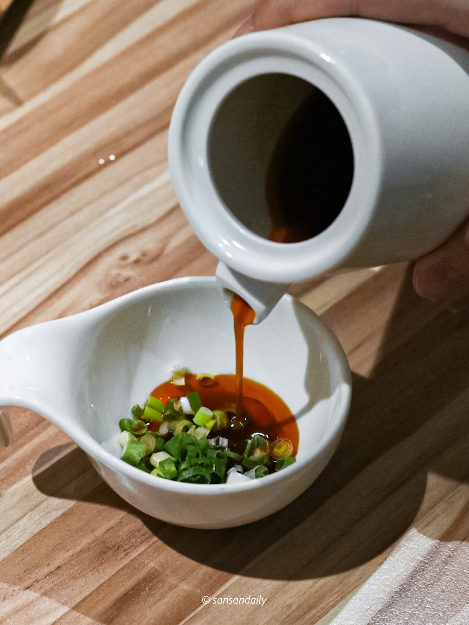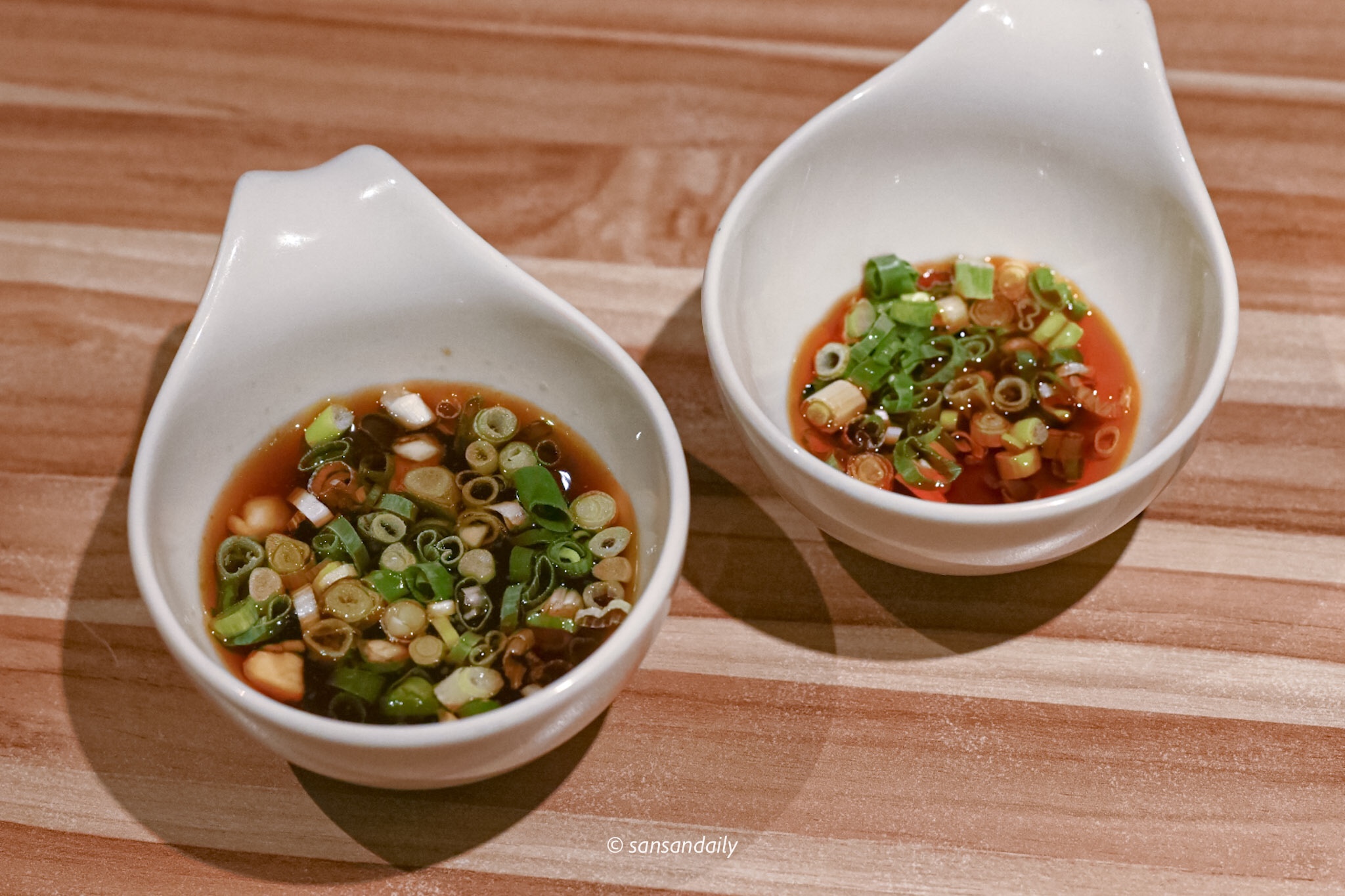 「汆食作伙鍋」在每桌都有附上一組沾醬,不用走來走去相當方便。包含店家特調的「柚子醬油」及「汆辣醬」,可依個人喜好添加新鮮蔥花、蒜末。