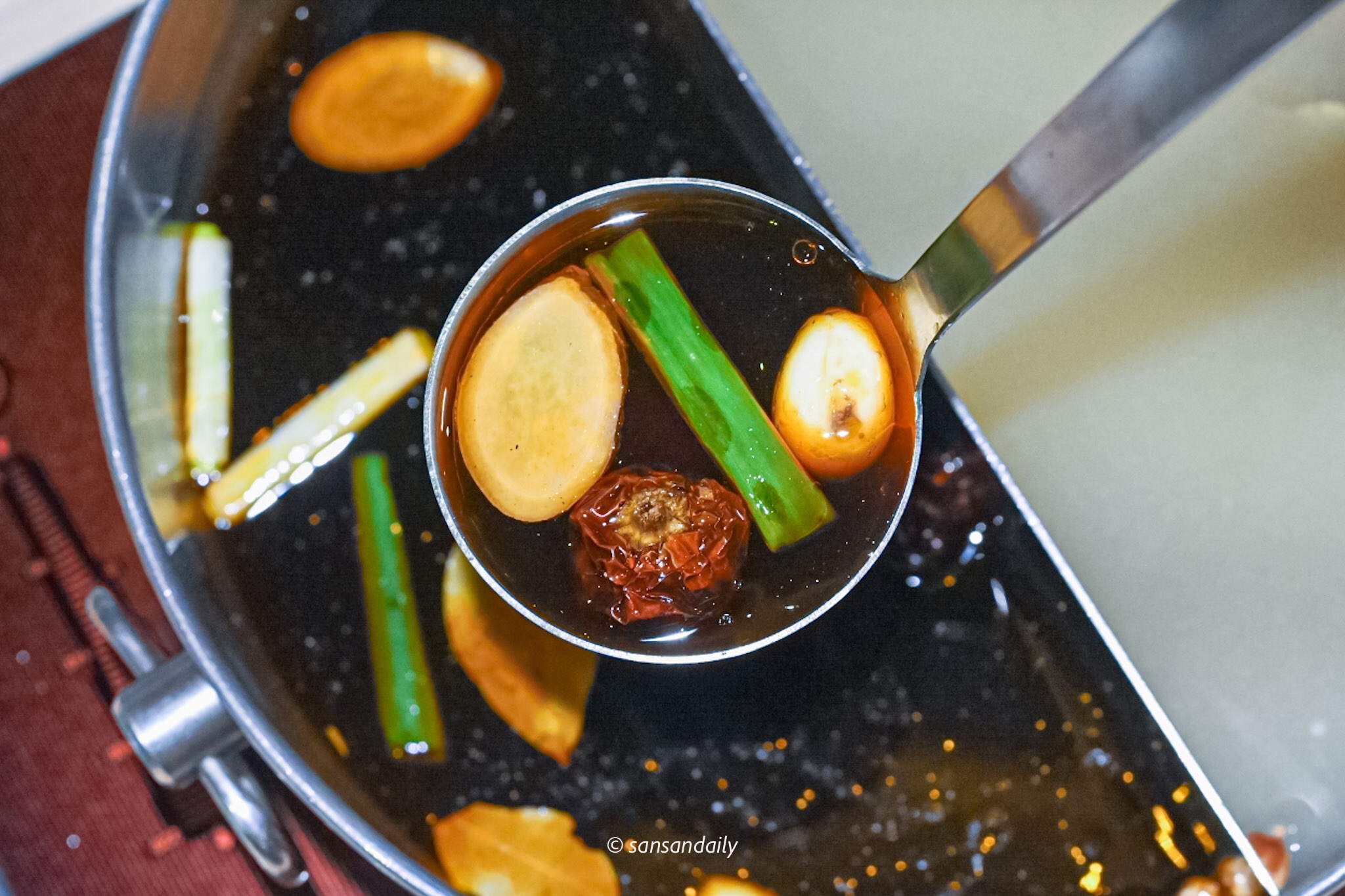 最後選了雞湯和麻辣:「金華雞湯」使用台灣本土老母雞、金華火腿、洋蔥、西芹為材料熬煮12小時,上頭再加上月桂葉增添香氣。「噴香麻辣鍋」則採用牛大骨及大紅袍、青花椒及燈籠椒等數十樣中藥材及新鮮蔬菜熬煮而成。