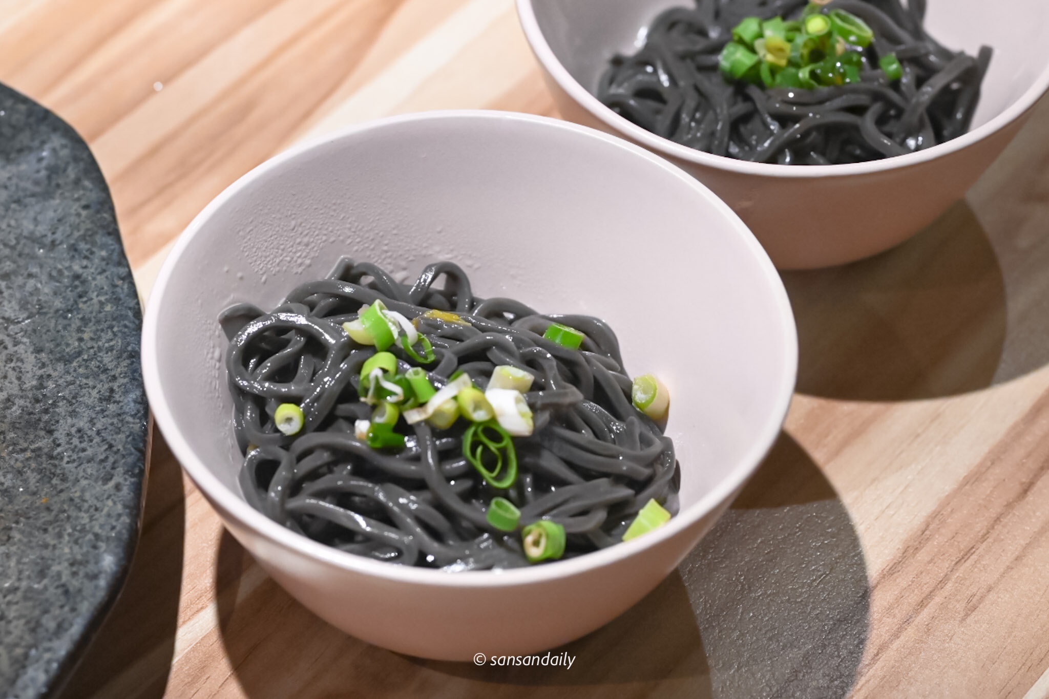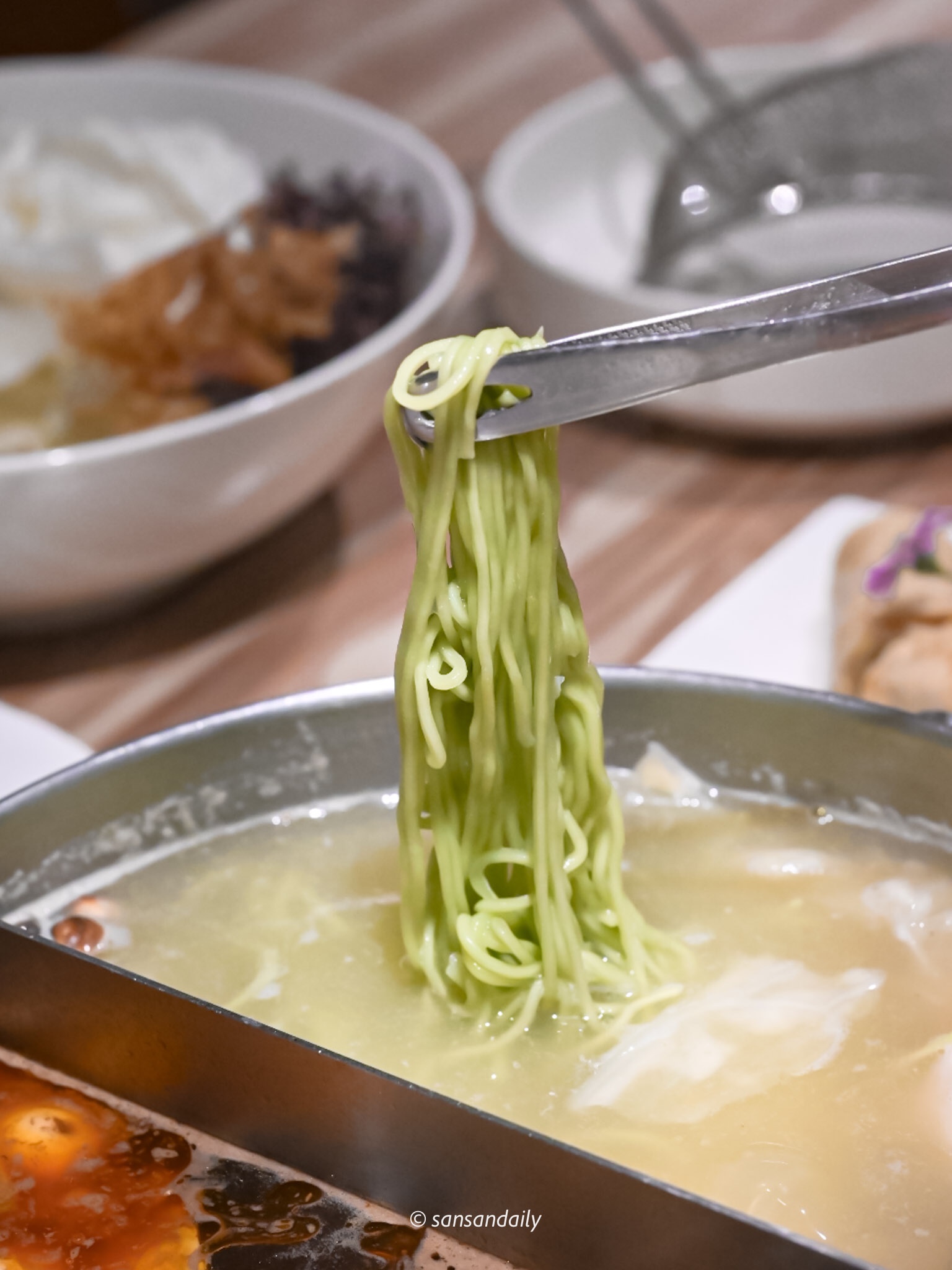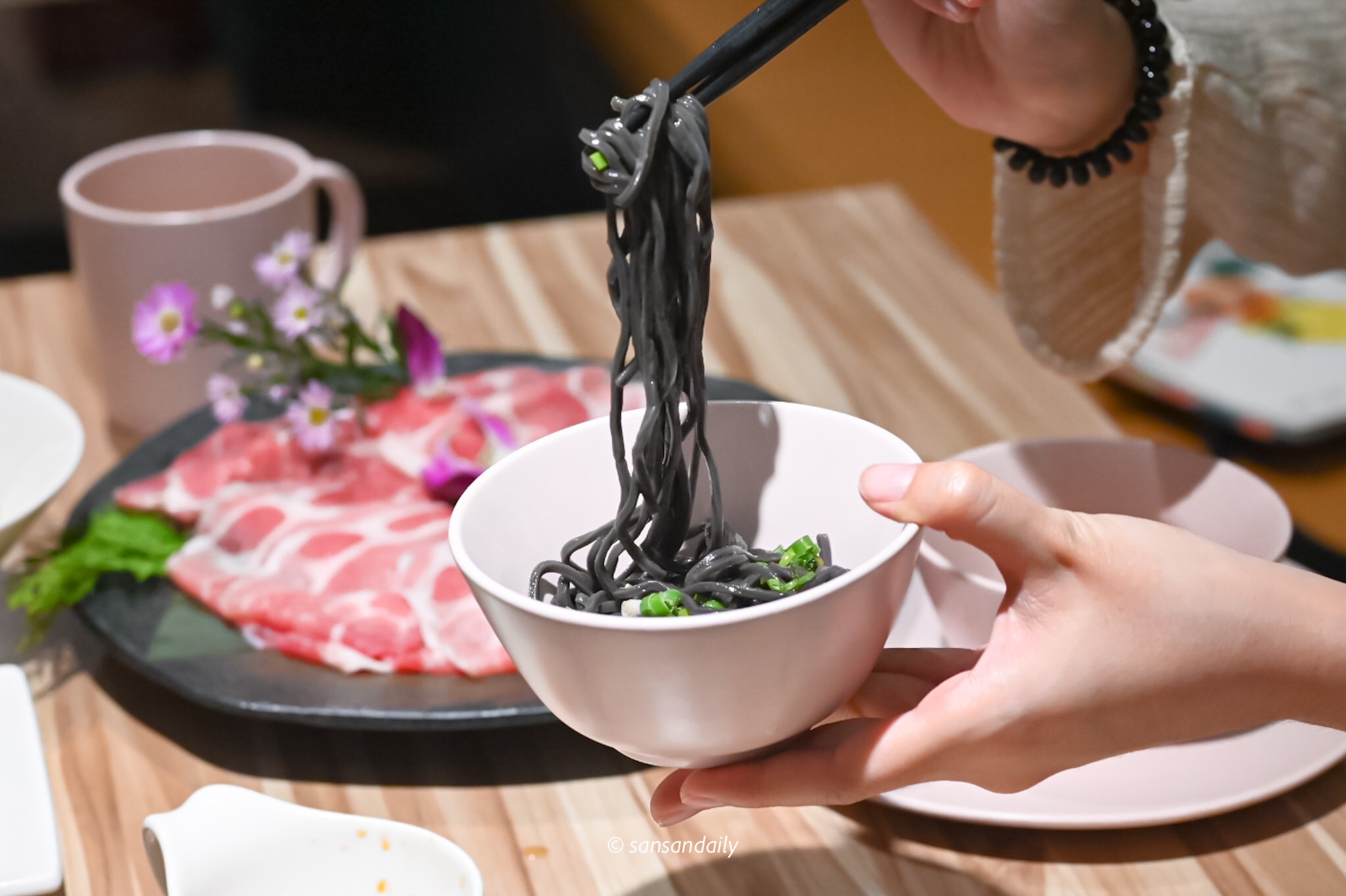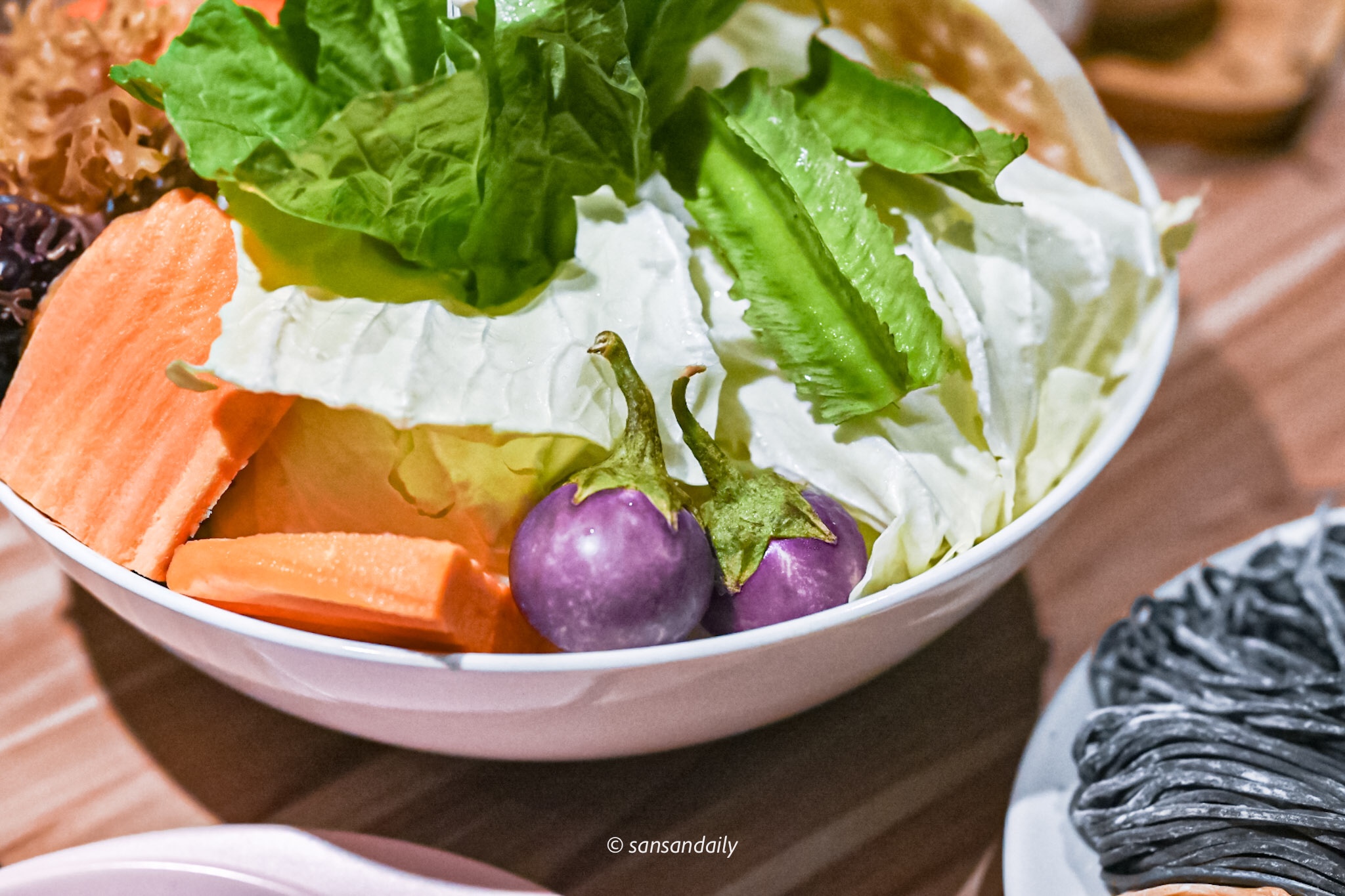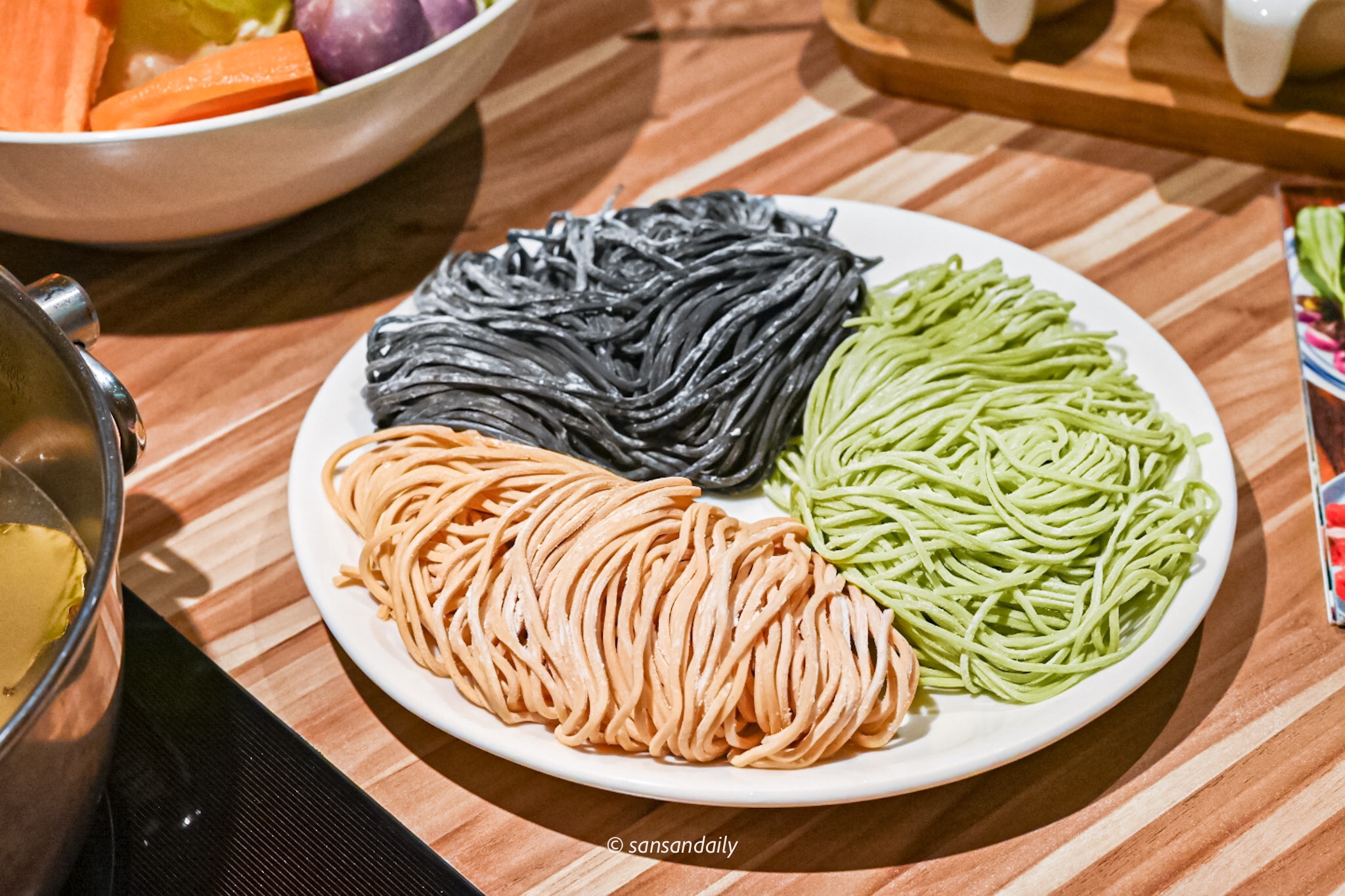 「汆食作伙鍋」副餐加20/人,可換成蔬菜拉麵,分為紅蘿蔔、墨魚、綠茶三種口味。