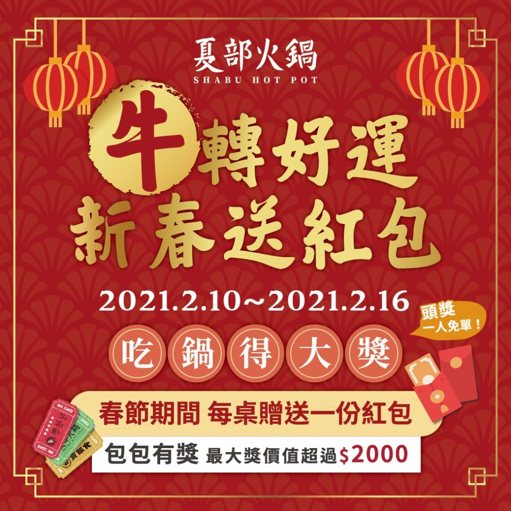 夏部火鍋 從 2021/02/10 至 2021/02/16 限時春節活動,任意時段每桌即可獲得一包紅包,最大獎可一人免費唷,快揪朋友或家人一起來吃吧!