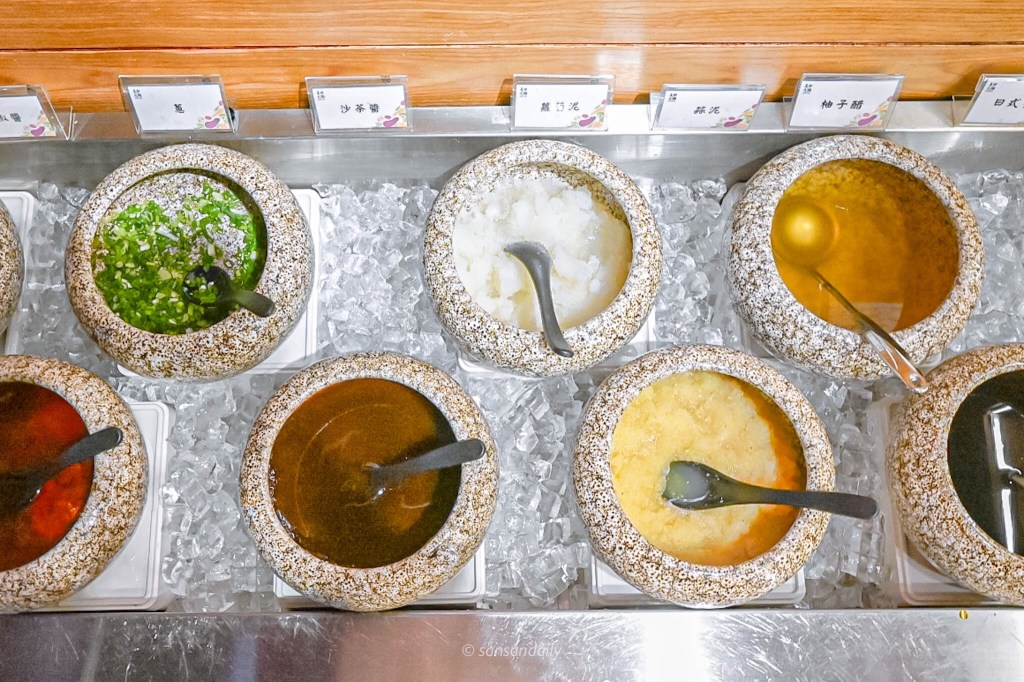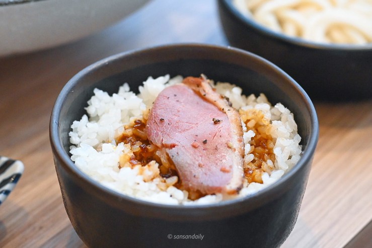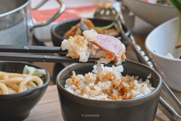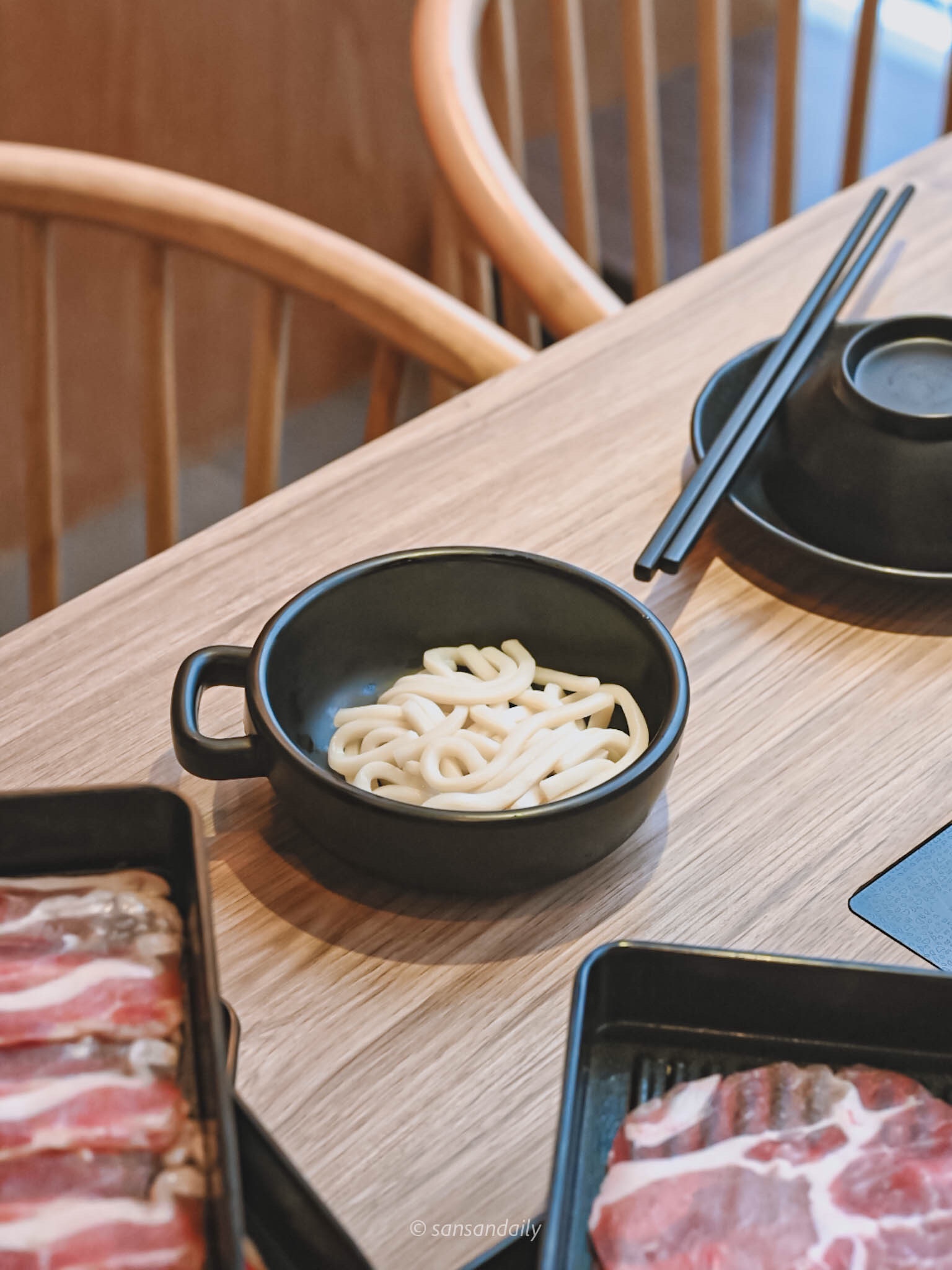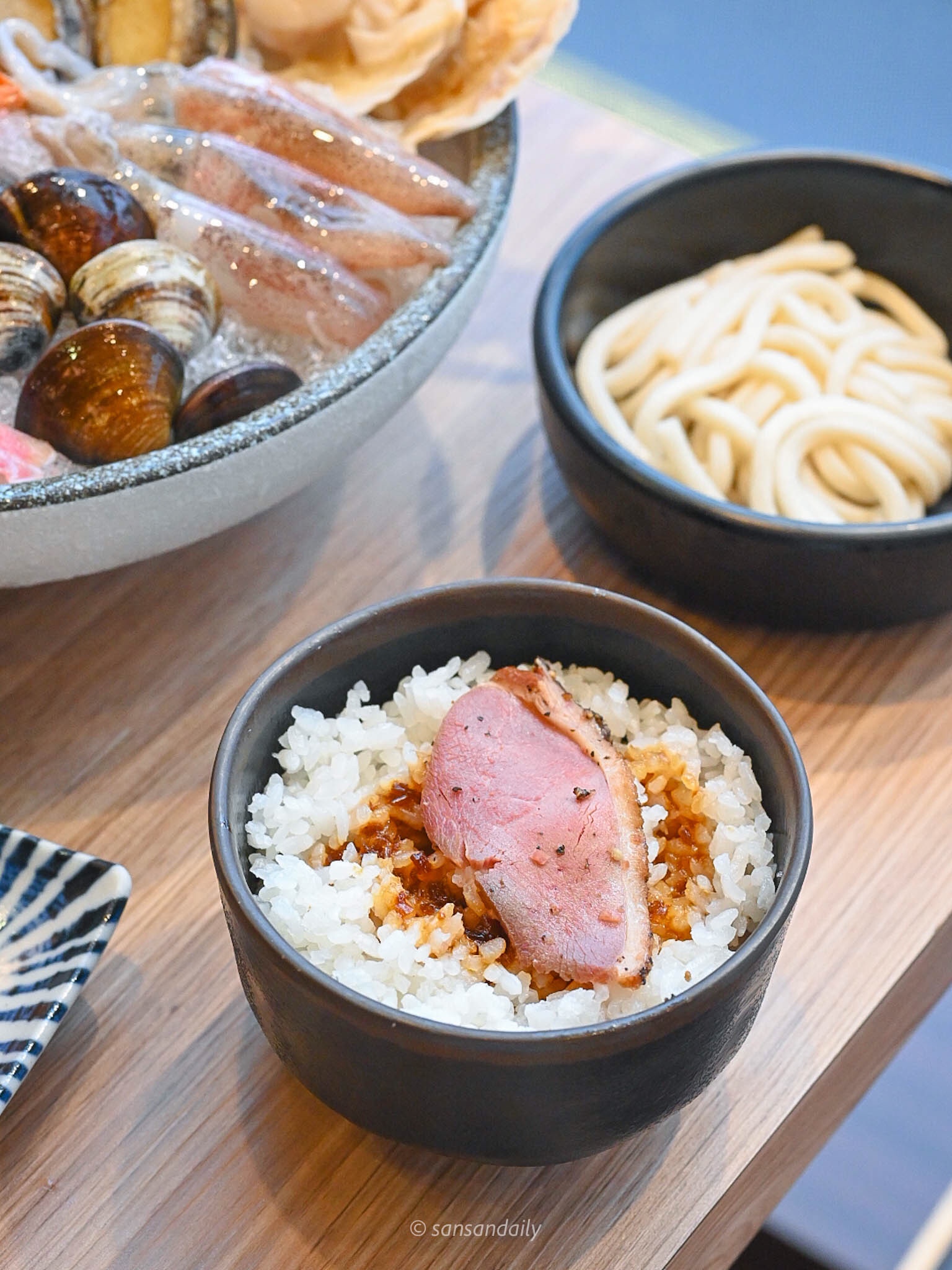 自選主食的部分可以到自助區自取快煮麵,但sansan也超推他們家的招牌「鴨油飯」還有壽喜燒一定要吃的「讚岐烏龍麵」。