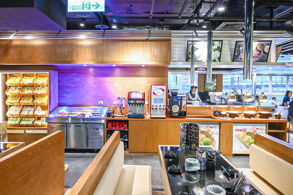 ▲ 自助吧分為兩個部分,這排規劃為飲料、甜點、Meiji冰淇淋、各式快煮麵以及熱食區。