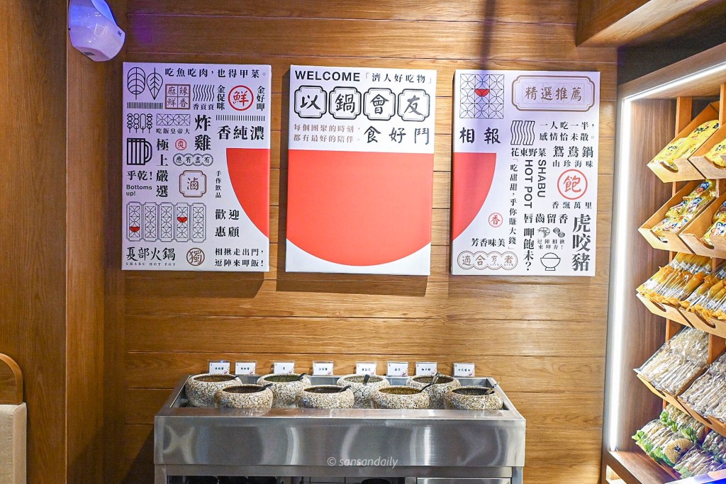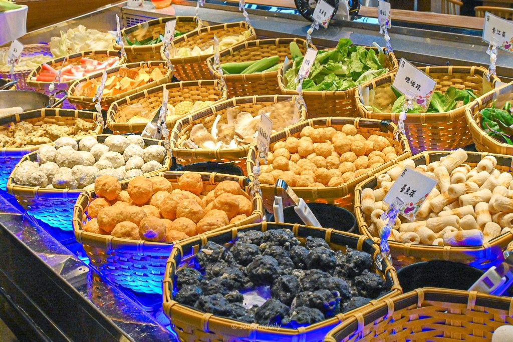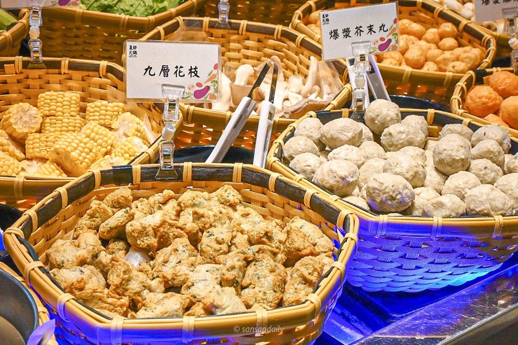 ▲ 自助吧還有一個很吸睛是這繽紛、一簍一簍的火鍋料區,有墨魚丸、爆漿芥末丸、爆漿麻辣丸、碰碰球、九層花枝、小竹輪、蟹肉棒等等。