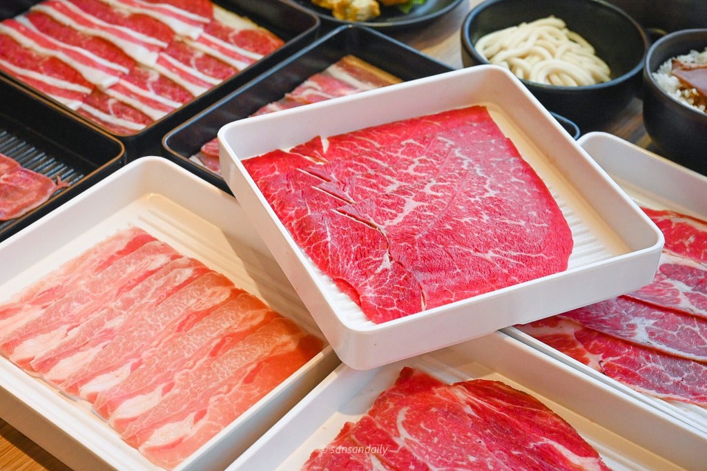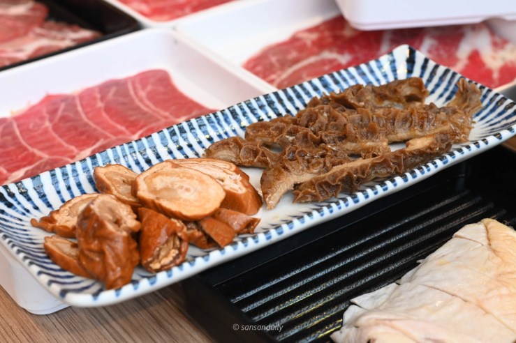 菜單上多樣豐富的肉品,請服務員都先上一份,十多種品項,光上桌的那種視覺感,就已經非常滿足,最期待的莫過於吃到飽比較少見的頂級食材:澳洲巧克力和牛、伊比利豬扇子肉、天使紅蝦等,還有很特別的「豬舌」!通常我們都吃牛舌,「豬舌」sansan也是第一次看到。