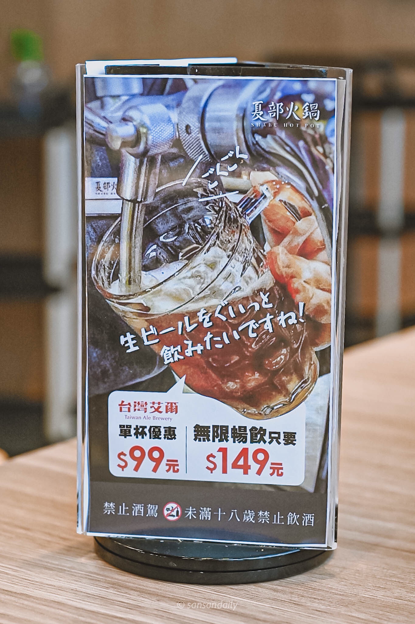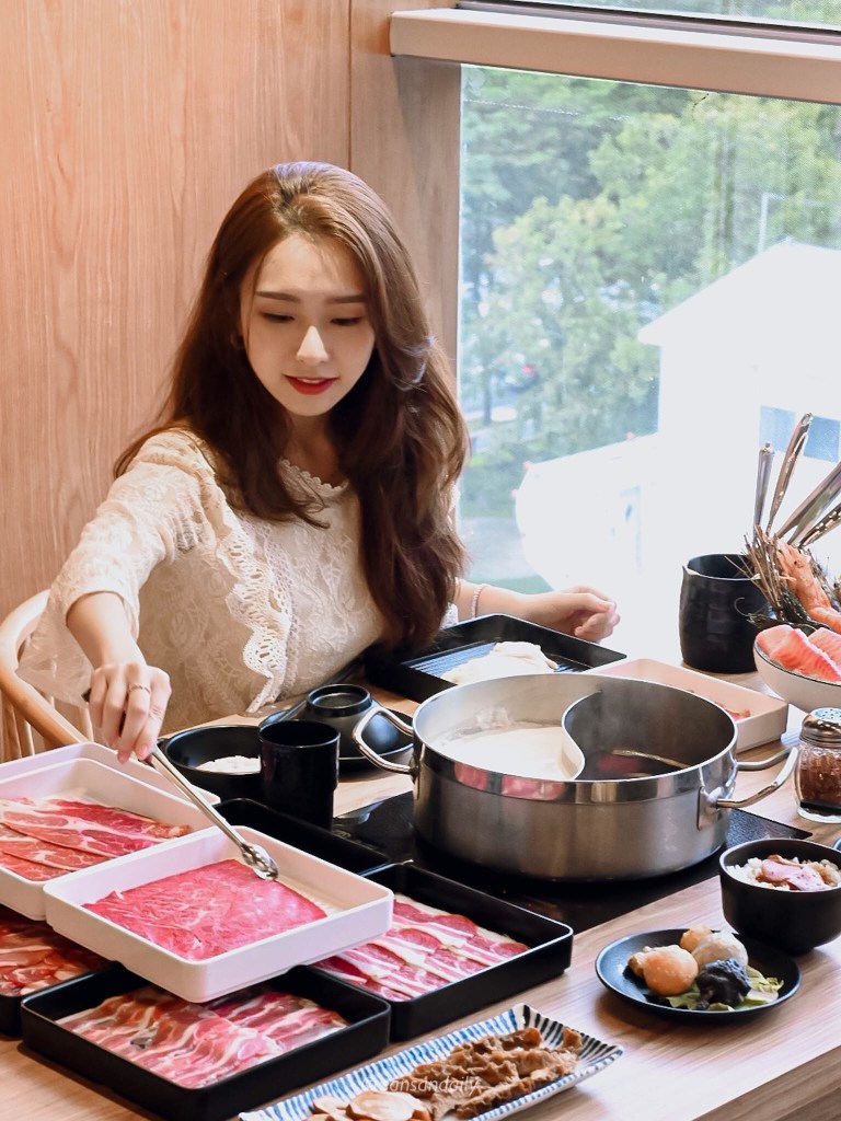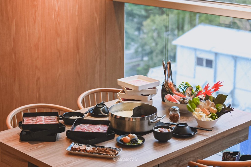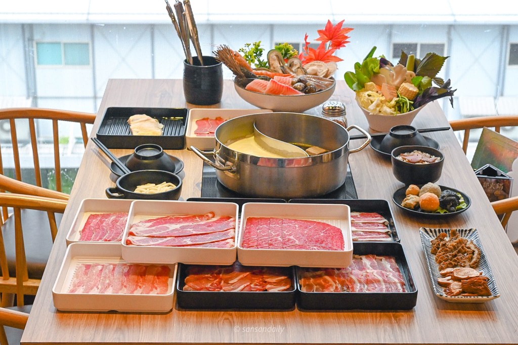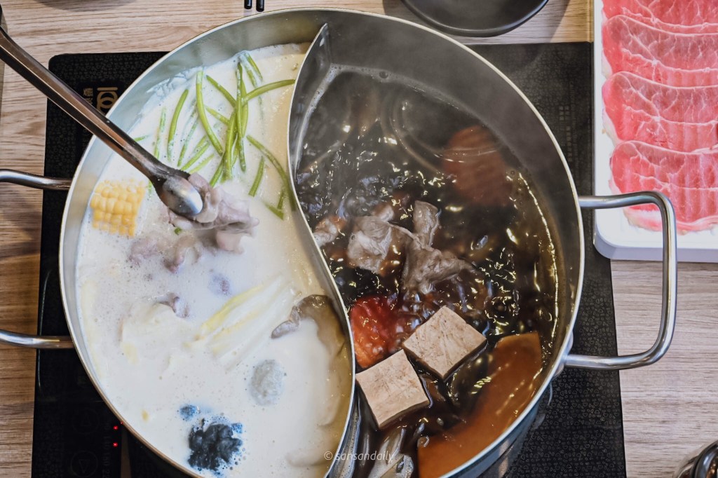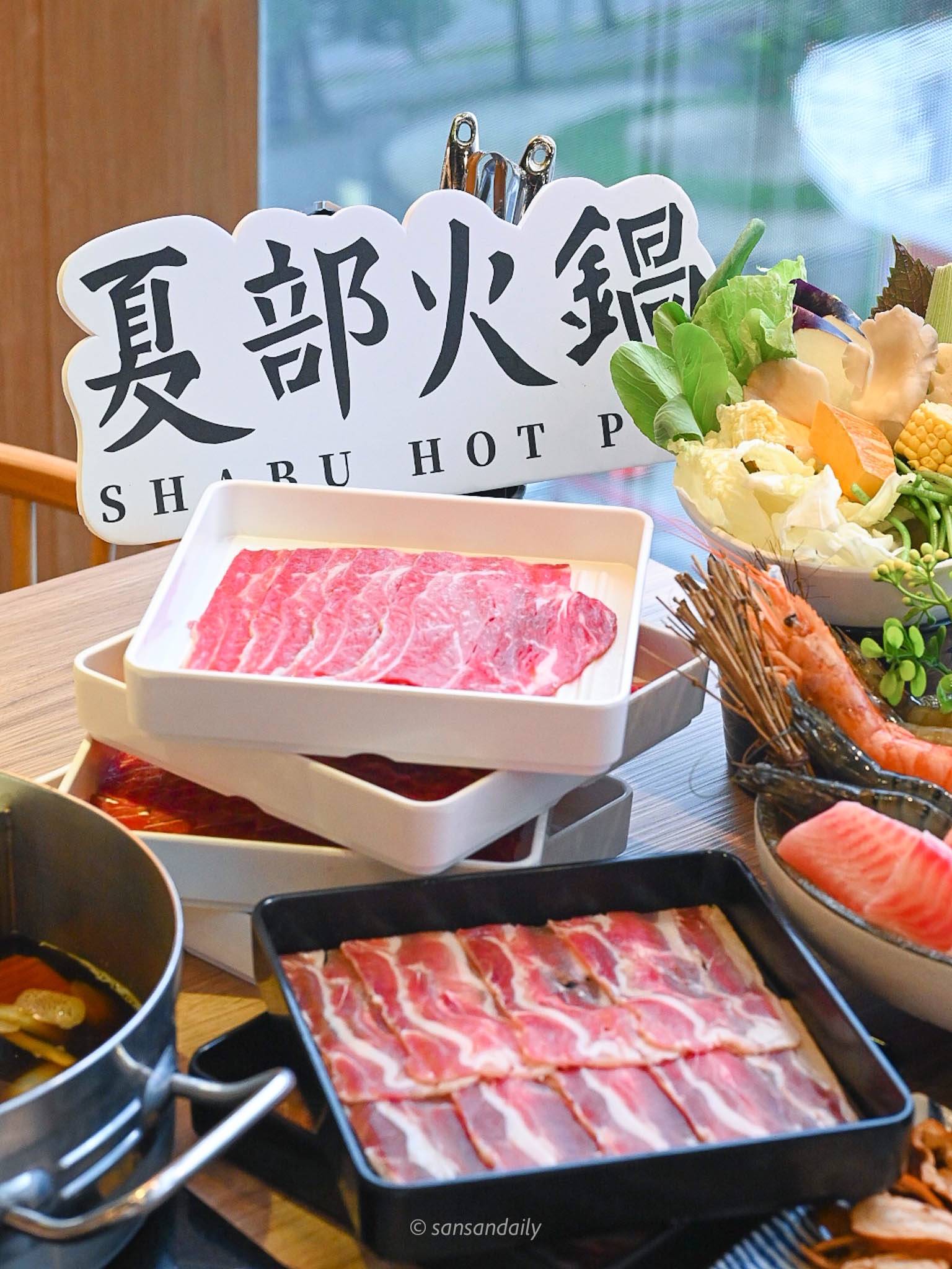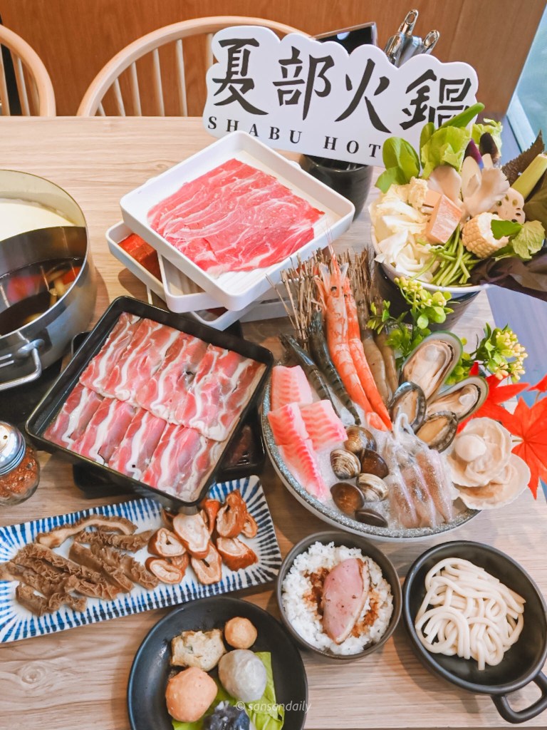 這次sansan和朋友選擇了$799/人的吃到飽套餐,菜單上所有食材皆可任點,包含雞、豬、牛、鴨、海鮮等。湯頭部分我們選擇了鴛鴦鍋,一邊是 夏部 高人氣的壽喜燒,另一邊是sansan吃鍋必點的豚骨牛奶鍋。