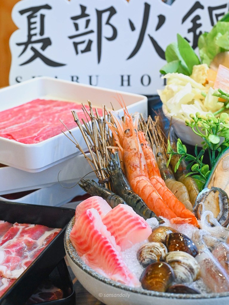 夏部火鍋 引進海港直送高檔海鮮:大白蝦、阿根廷天使紅蝦、生鮮半殼扇貝、半殼淡菜、生小卷及台灣鯛魚腹片。除了質地飽滿、鮮美可口外,與壽喜燒及豚骨牛奶鍋都相當合拍。