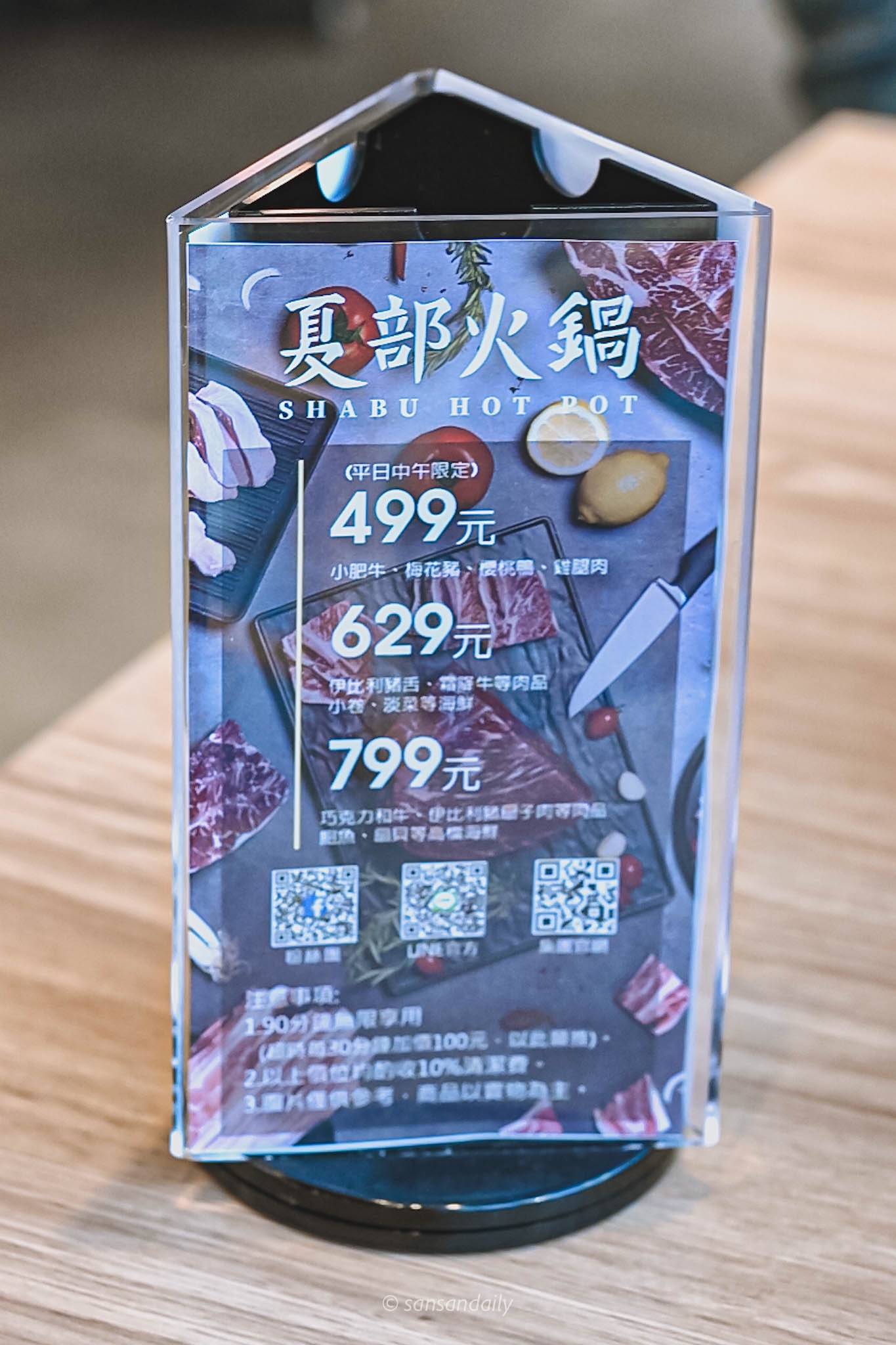 夏部火鍋的消費方式採「吃到飽自助吧+點餐」模式,依食材等級共有三種價位可選擇,分別是$499/人(平日中午限定)、$629/人以及$799/人,另加一成服務費。