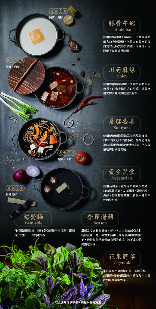 - 湯底不分價位,可任選豚骨牛奶、川府麻辣、夏部壽喜、黃金蔬食以及季節湯頭。