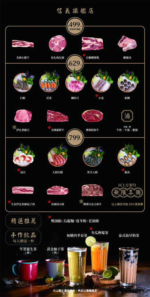 - $499/人:美國小肥牛、彰化梅花豬、宜蘭櫻桃鴨、雞腿肉