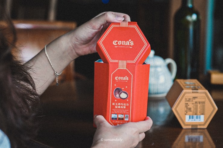 Cona’s 嚴選有「紅寶石」之稱的「日月潭台茶18-紅玉紅茶」,結合產地精選45%牛奶巧克力。入口是清甜的茶香特別順口,內層包裹著帶有牛奶香氣的澳洲高品質夏威夷果,茶的香氣、巧克力的濃郁與夏威夷果的脆口,多層次的味蕾享受讓人一吃就愛上。