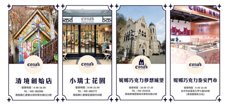 之後我也要找時間來走訪Cona’s妮娜巧克力的四間門市:像公主童話裡的埔里妮娜巧克力夢想城堡、回歸童心的清境妮娜巧克力–創始店、一秒置身歐洲的清境妮娜巧克力–小瑞士門市和粉紅夢幻的泰安妮娜巧克力-國道1號北站。