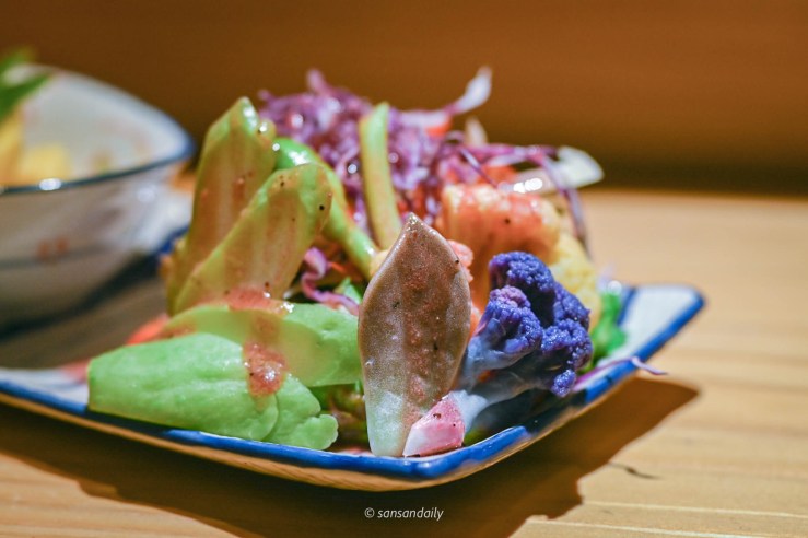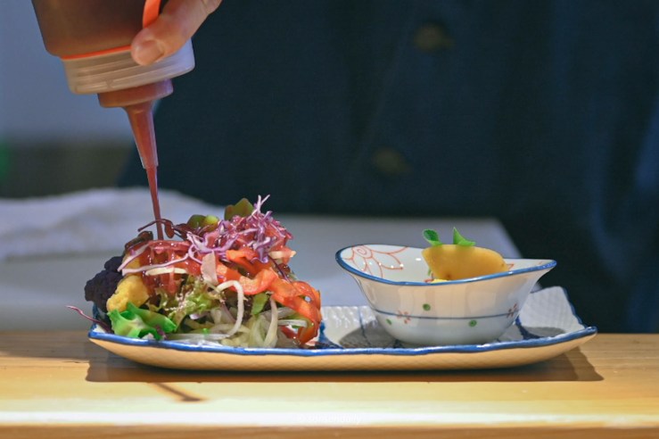 首先端上的是時蔬沙拉,包含黃花菜、紫花菜、翼豆、朱姬甜椒、晚香玉筍、櫛瓜、空心菜、石蓮花、佛手瓜、檸檬香草地瓜)佐草莓葡萄醬。好多沒見過的蔬菜,實在是新奇有趣~