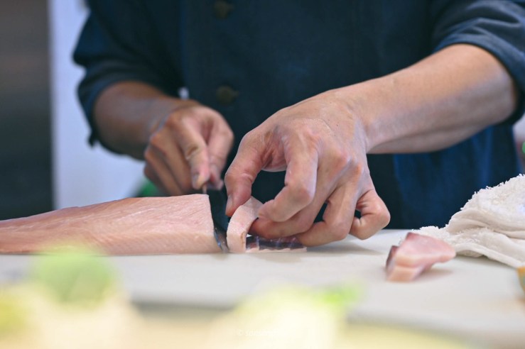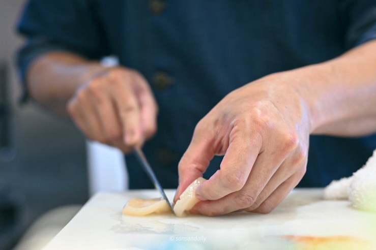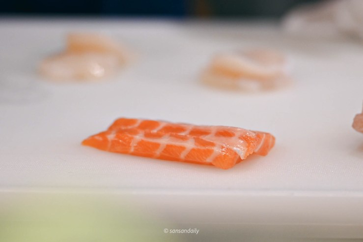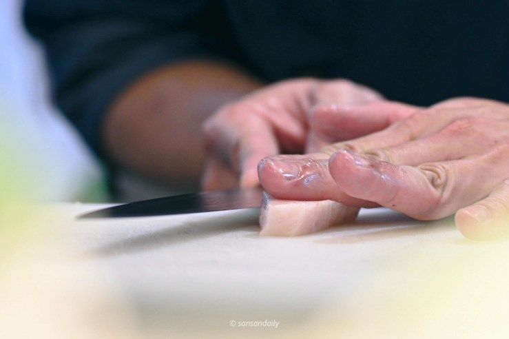 接著是我很愛的板前秀,看著師傅的刀功在魚片上安靜的刀刀落下、刀法俐落工整,完全是一種療癒呀