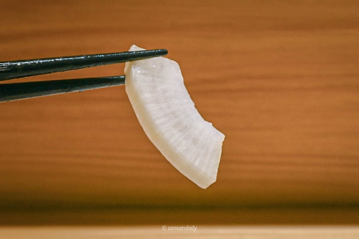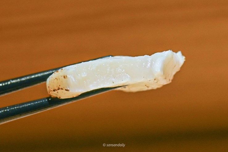 師傅在生魚片中間劃一刀,中間包入一小坨柚子胡椒,鹹鹹帶有柚子香的柚子胡椒醬,再生魚片中吃到另一種獨特風味。