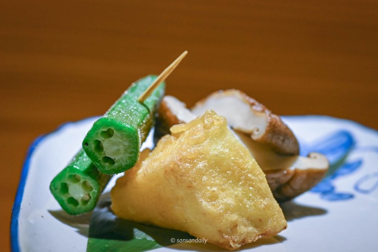鹽烤鮮香菇佐松露油、酥炸芋香冬瓜與鹽烤秋葵海鰻醬。