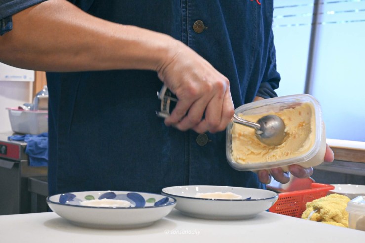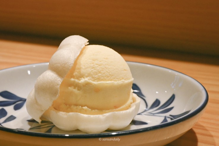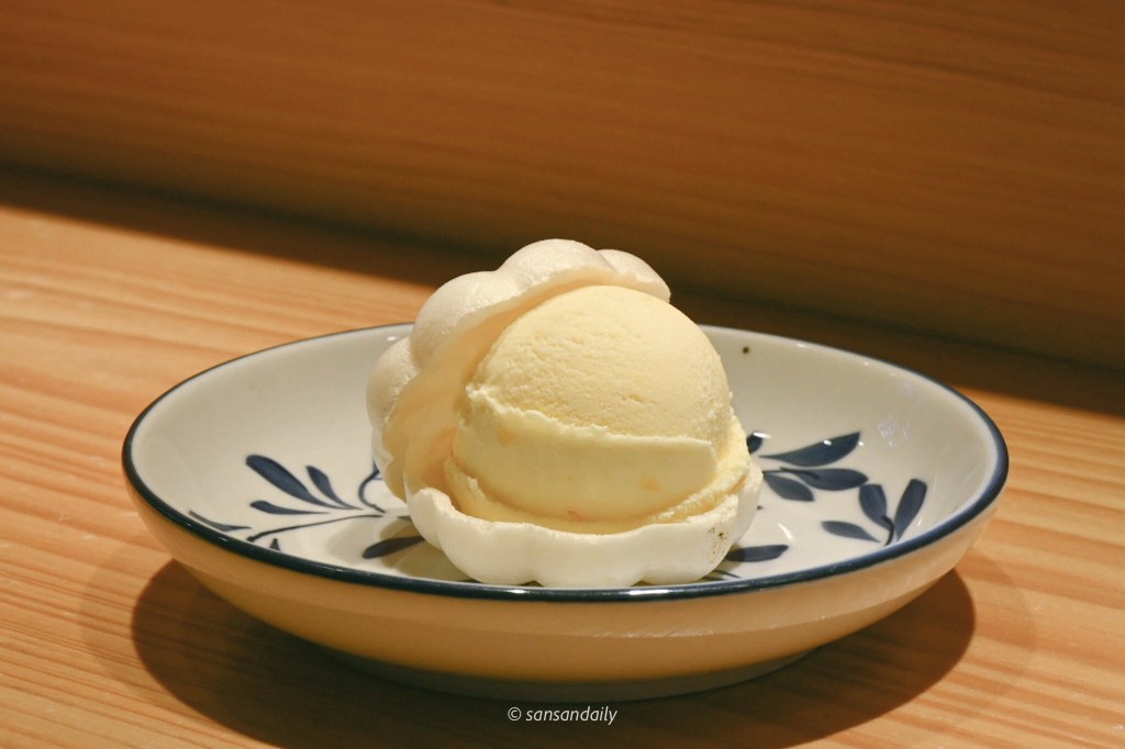 甜度適中完全沒有化學甜味的自製芒果冰淇淋,夾在sansan第一次嘗試的「最中餅」裡,脆皮口感和滑順的冰淇淋,為這餐日式無菜單料理畫下完美句點。