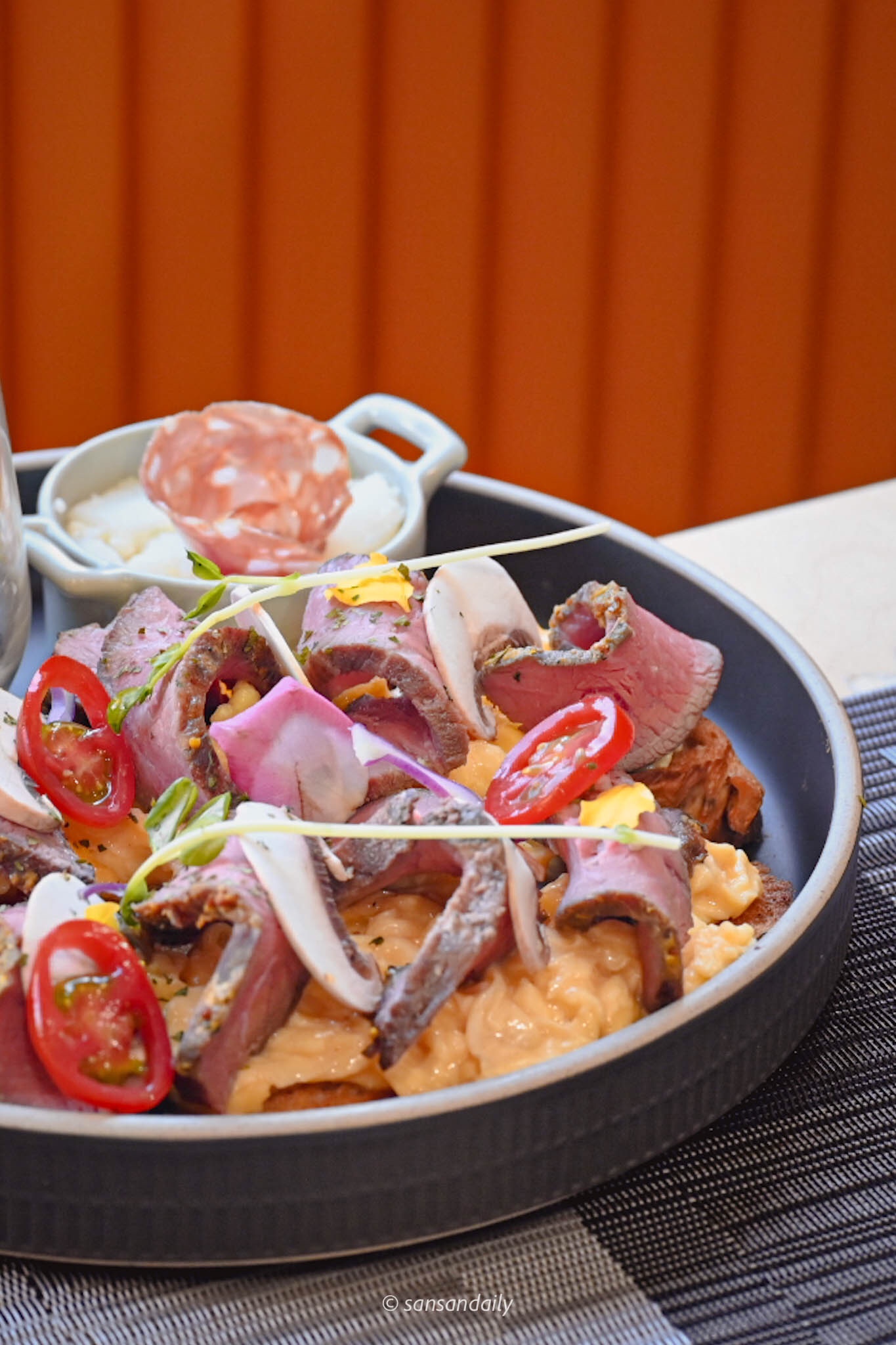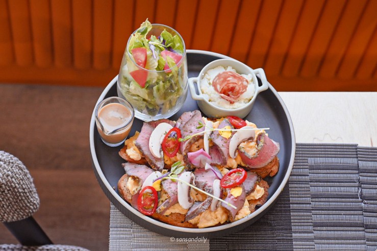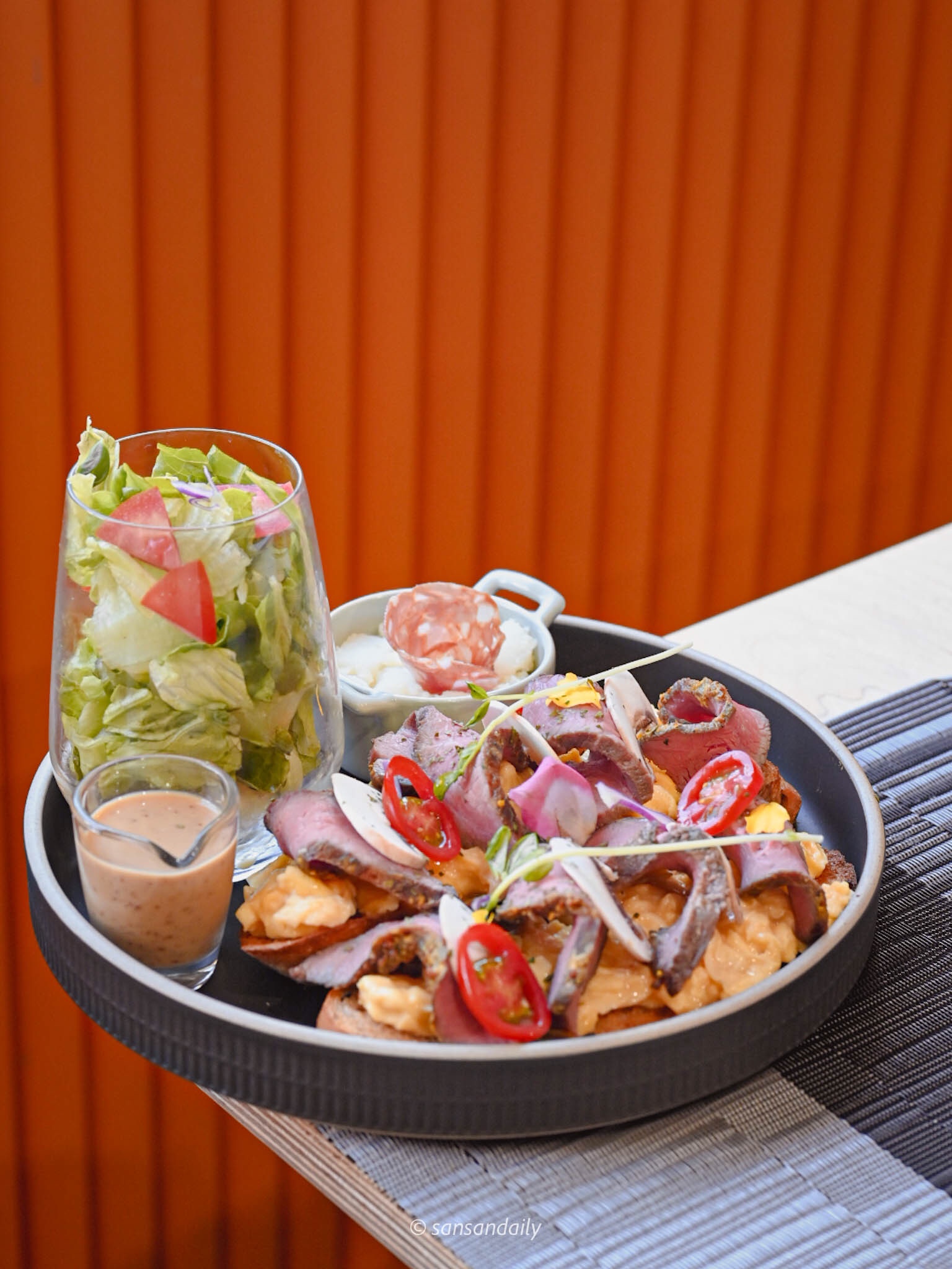 「費城烤牛排蛋」的最下層是香氣超夠、麵包控sansan很愛的切片雜量葡桃乾麵包,鋪上一層滑蛋增添香氣與均衡營養,最後鋪上漂亮的舒肥烤牛排切片,蛋白質滿滿的一道美味創意餐點!
