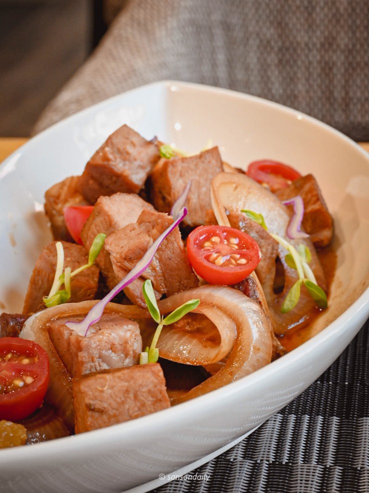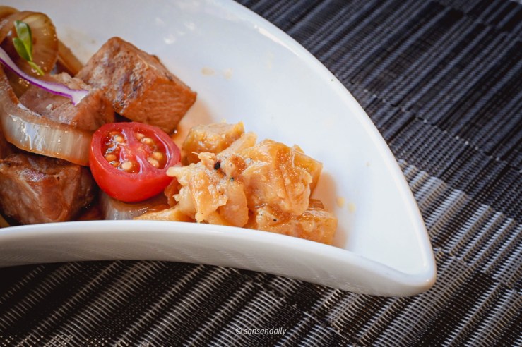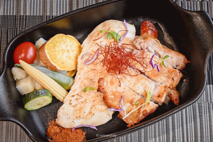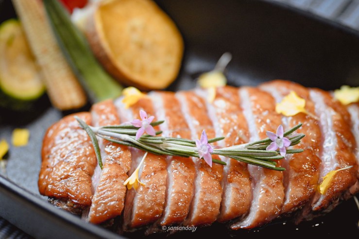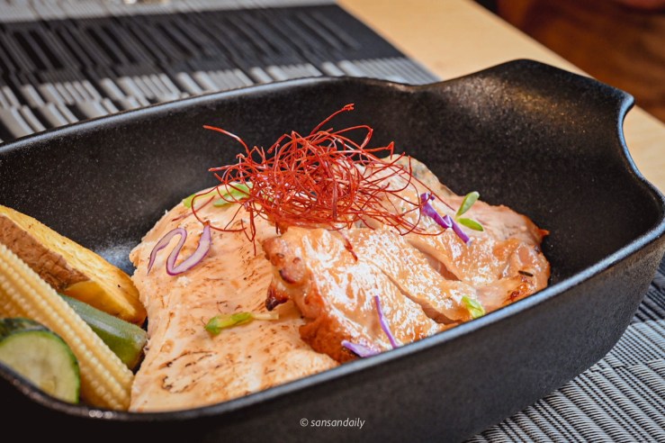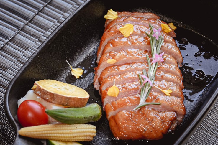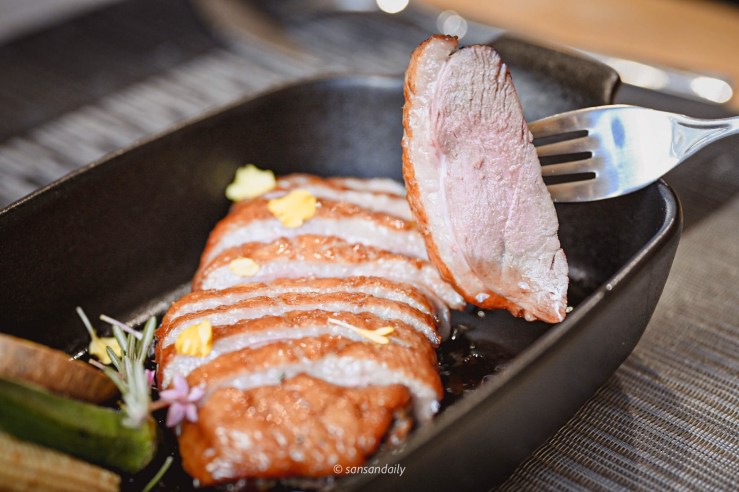 低溫烹調紅椒粉醃製而成的新鮮屏東家鄉嫩烤梅花豬,切成骰子一口大小,鹹香的醬汁單吃就挺不錯,搭配一旁的鳳梨醬料更增添風味。