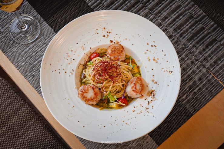 三大顆肥嫩的奶油香煎生食級干貝,一入口充滿干貝的鮮甜,中間半熟的狀態讓口感更加軟嫩。