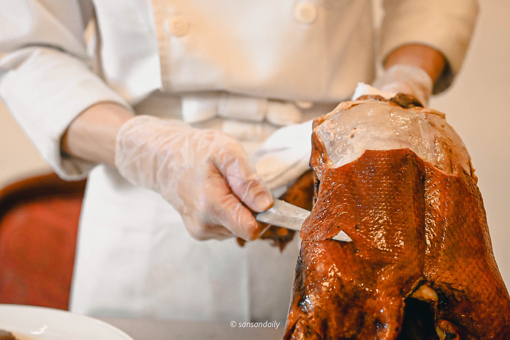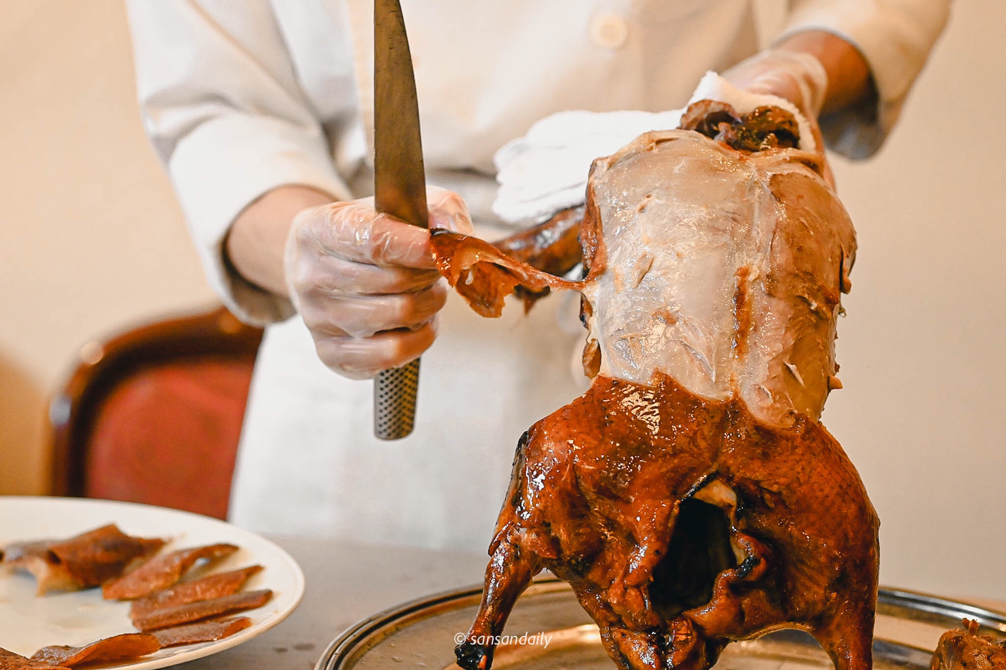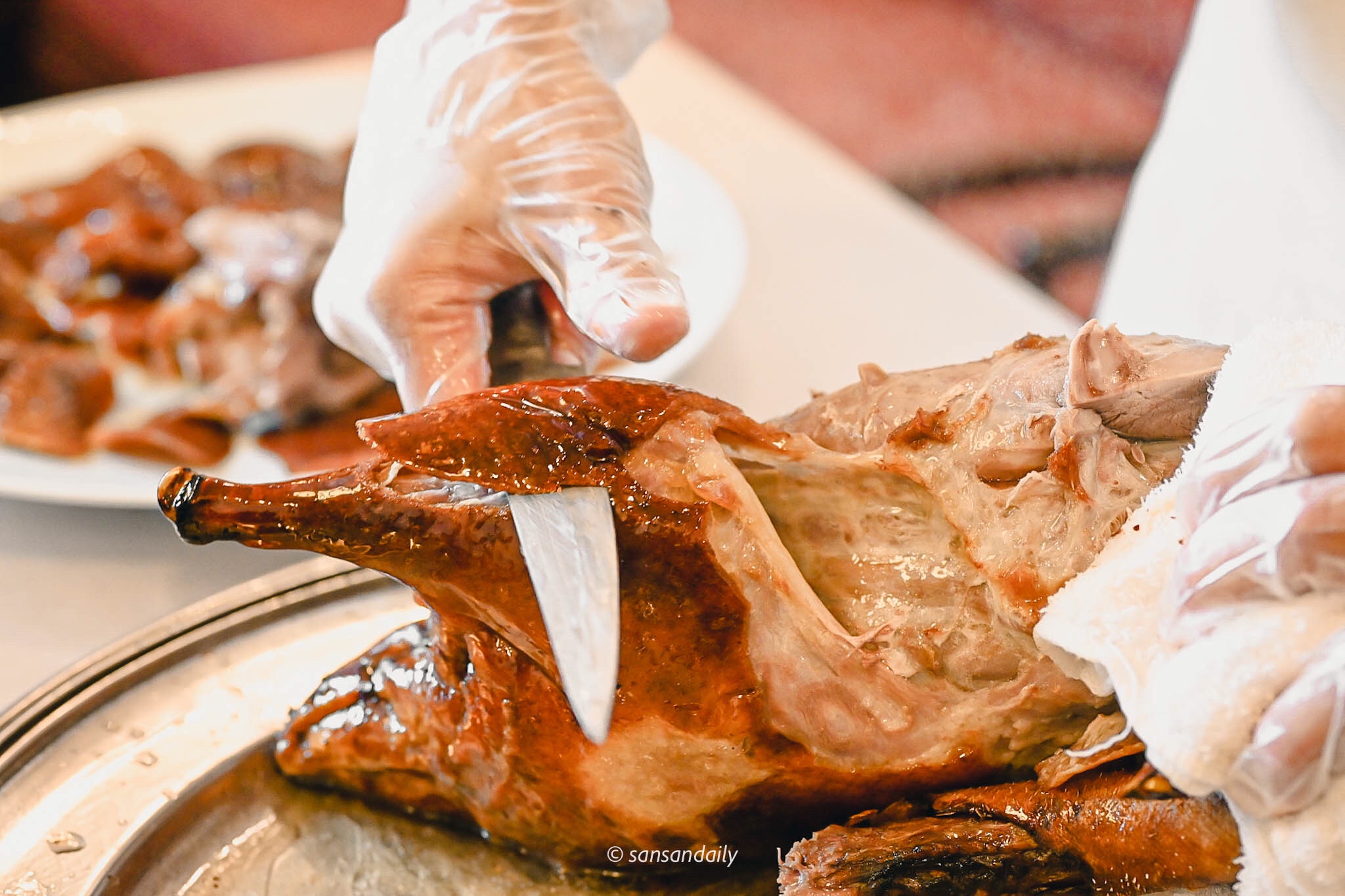 熟練的片皮秀在利索的刀工下迅速進行,看著接著滿盤油亮亮的鴨油,好想拌飯吃呀!(感覺白飯淋上幾圈鴨油和醬油, 一定超級銷魂)