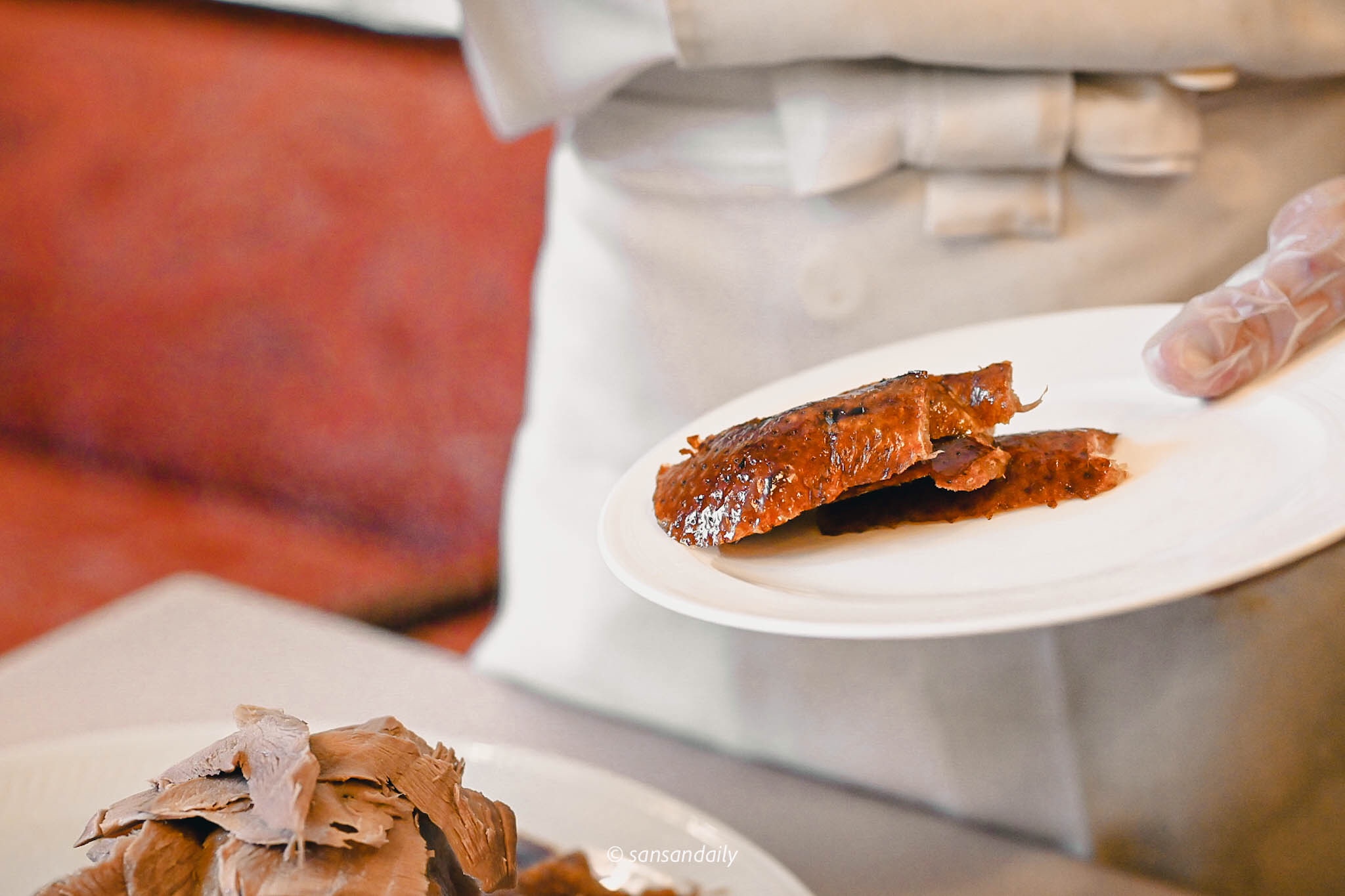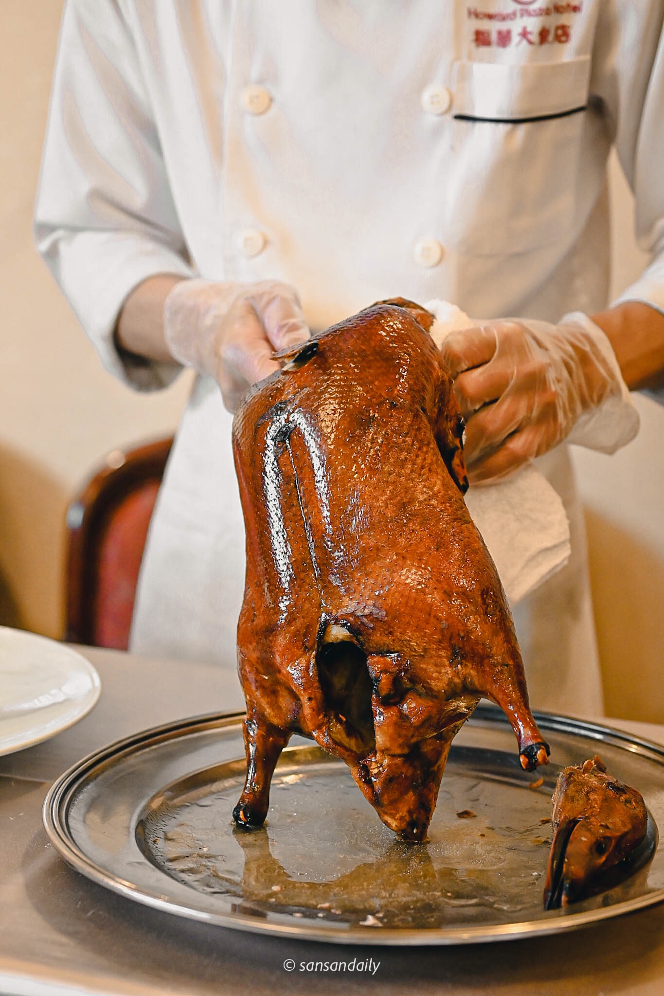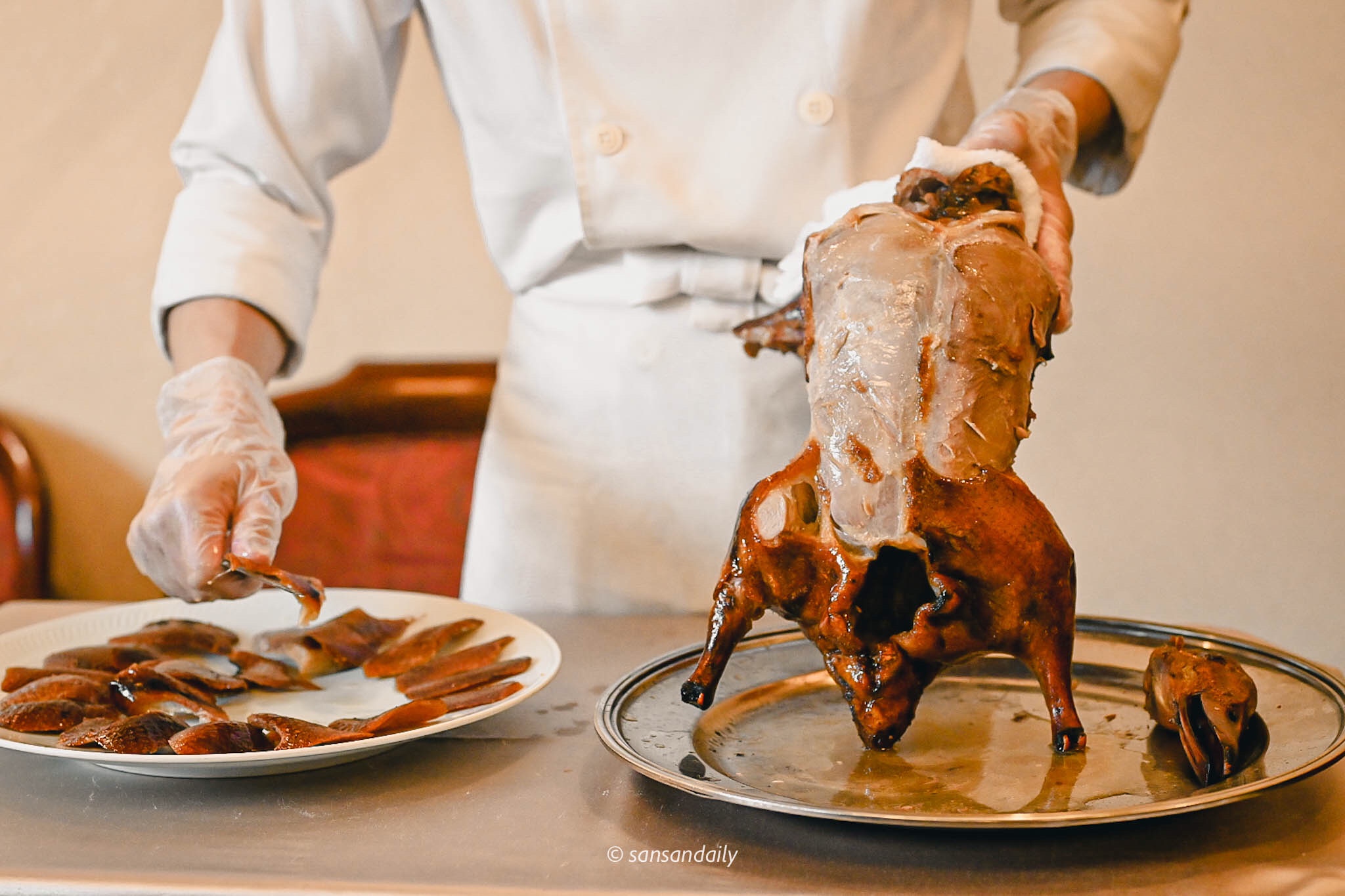 熟練的片皮秀在利索的刀工下迅速進行,看著接著滿盤油亮亮的鴨油,好想拌飯吃呀!(感覺白飯淋上幾圈鴨油和醬油, 一定超級銷魂)