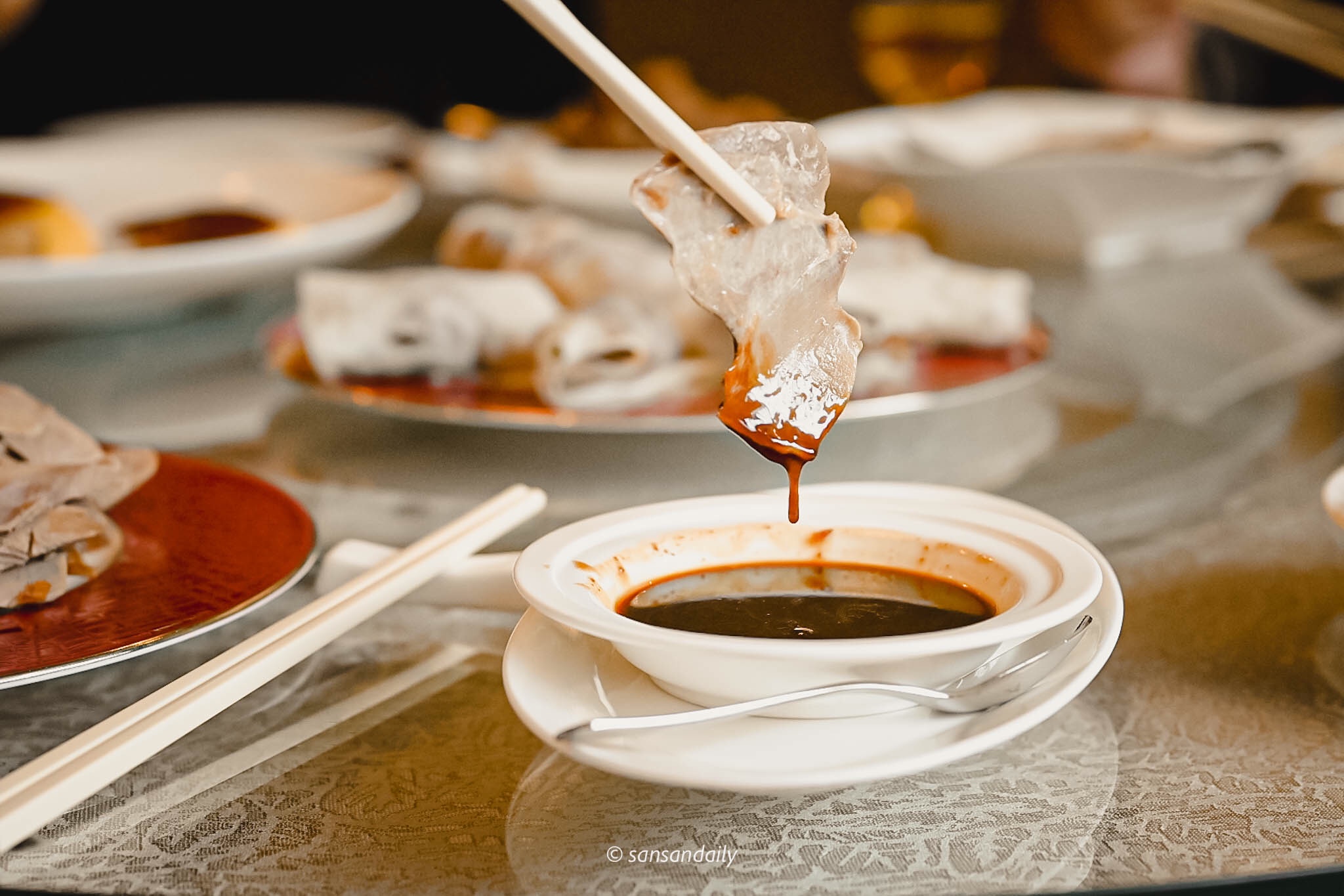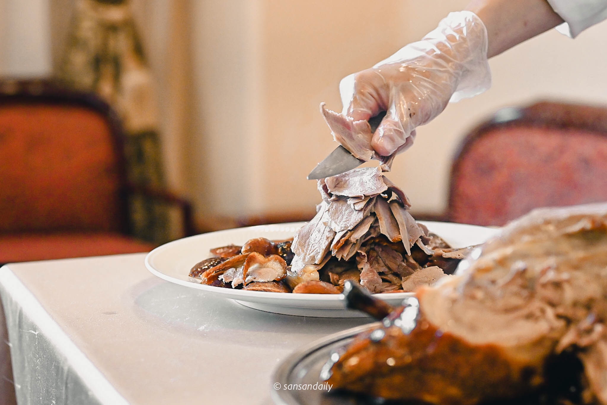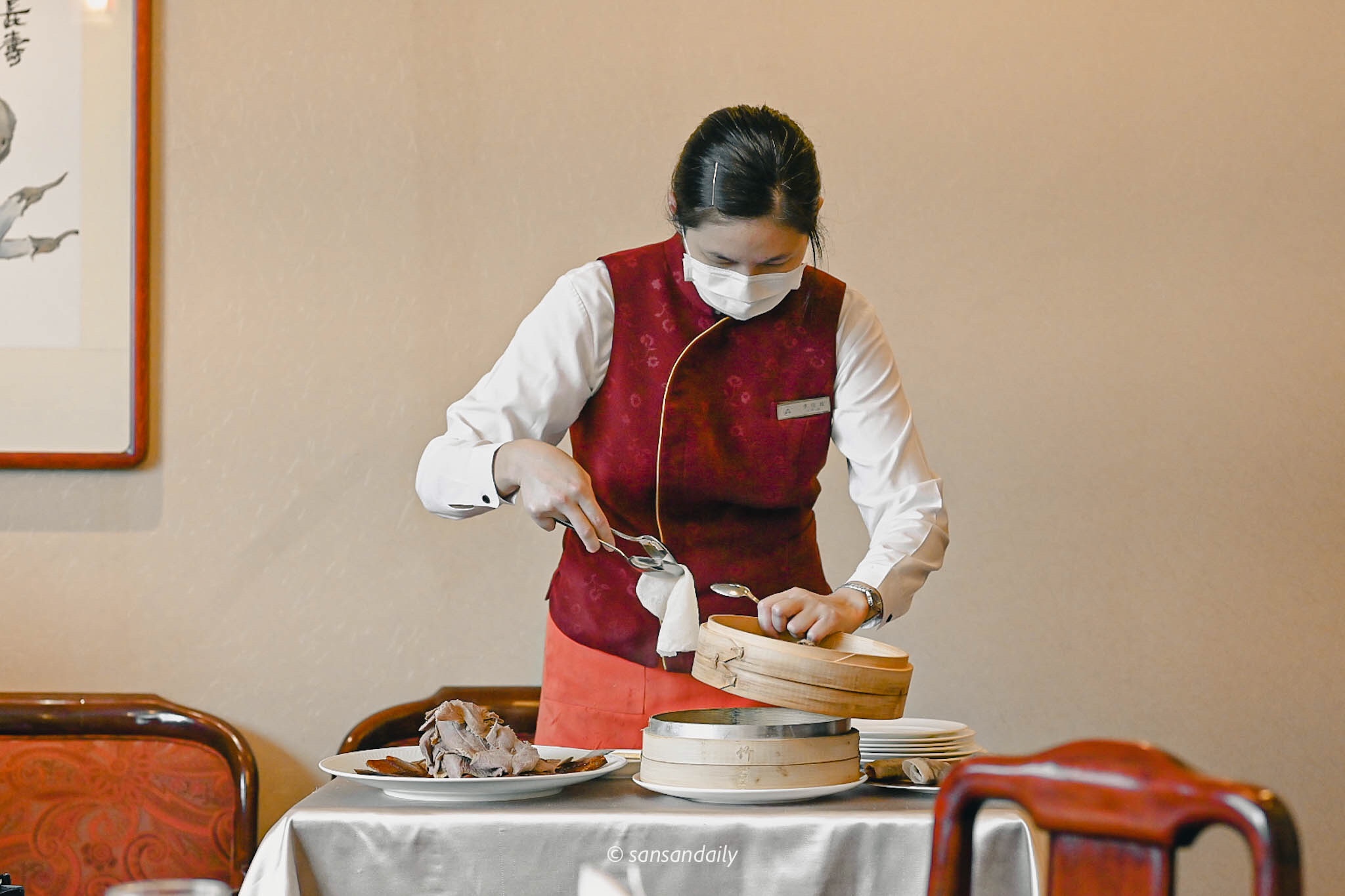 江南春的師傅將盛著烤鴨的推車推進包廂,十幾隻眼睛猛盯著金黃肥美的櫻桃烤鴨,期待著待會精彩的重頭戲「片鴨秀」!