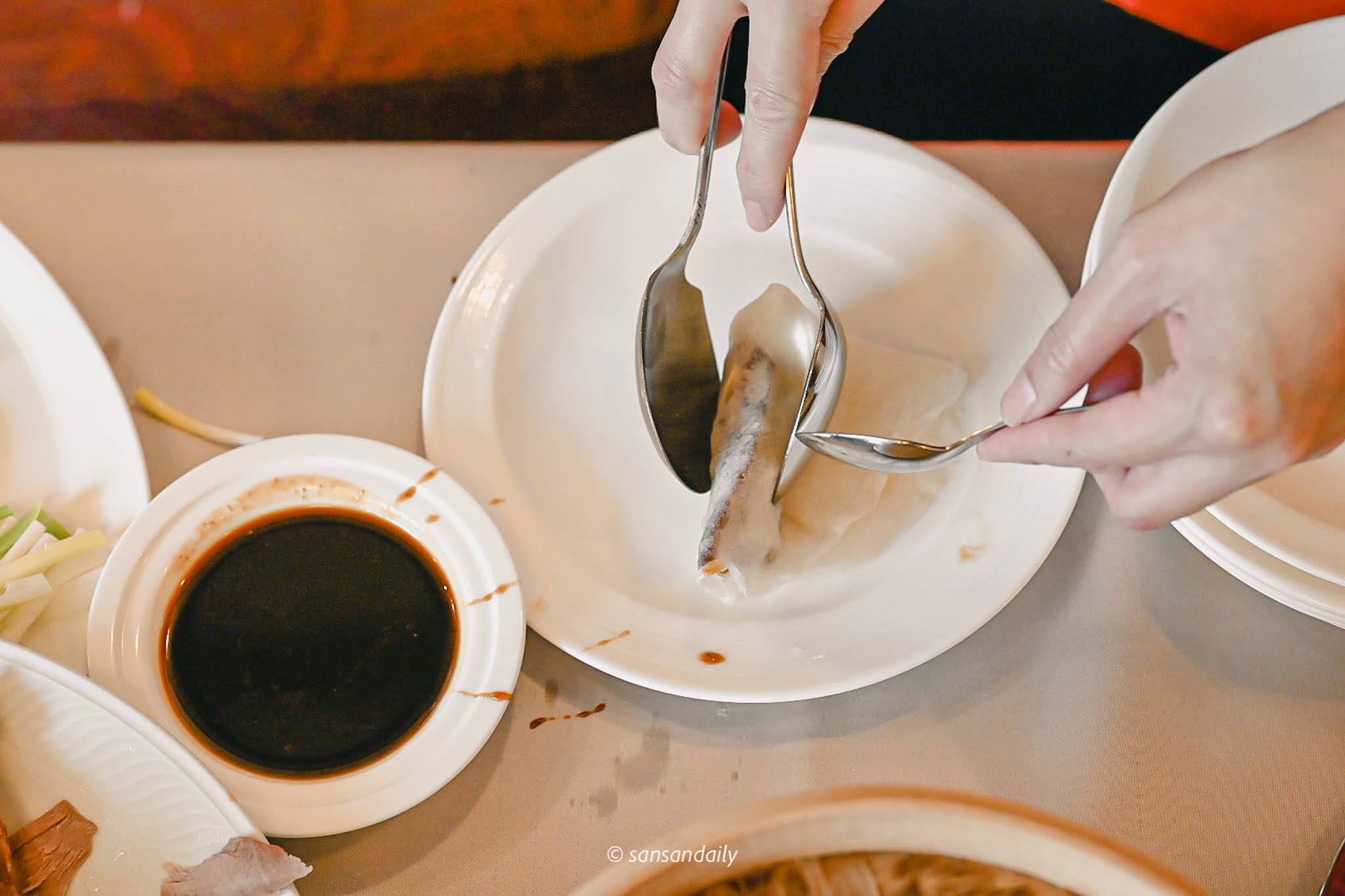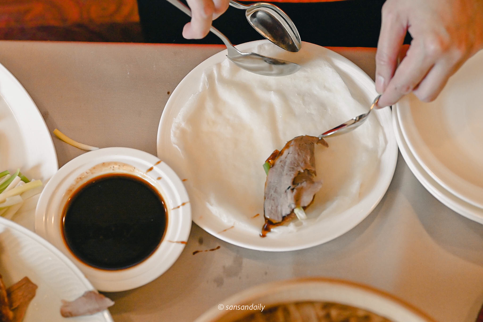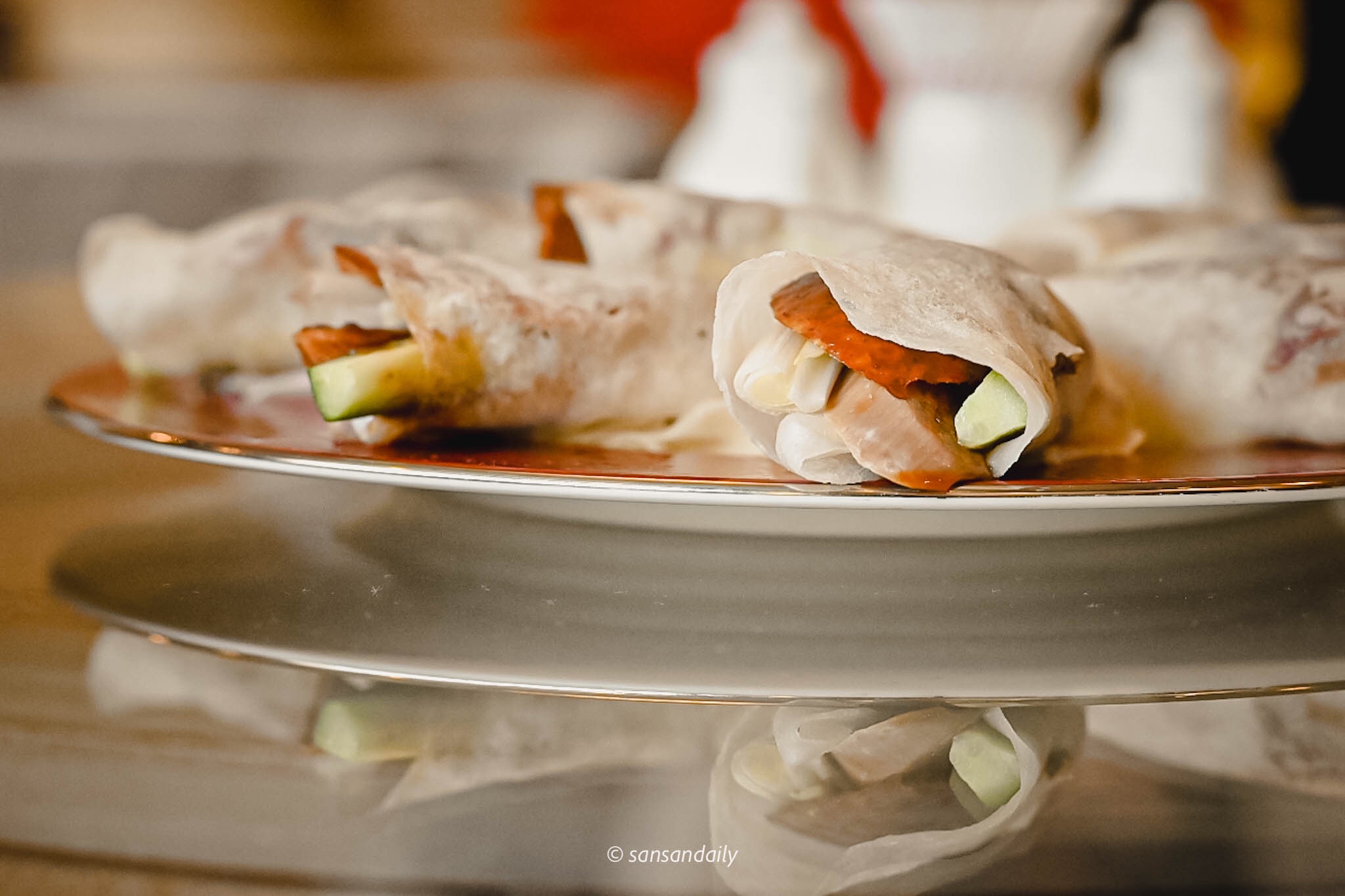欣賞完主廚精湛的片鴨秀,服務員接著進行下一道桌邊料理秀「鴨肉捲餅」,手工Q彈餅皮中包入屏東小黃瓜、宜蘭三星蔥與沾上適量甜麵醬的宜蘭片皮烤鴨。