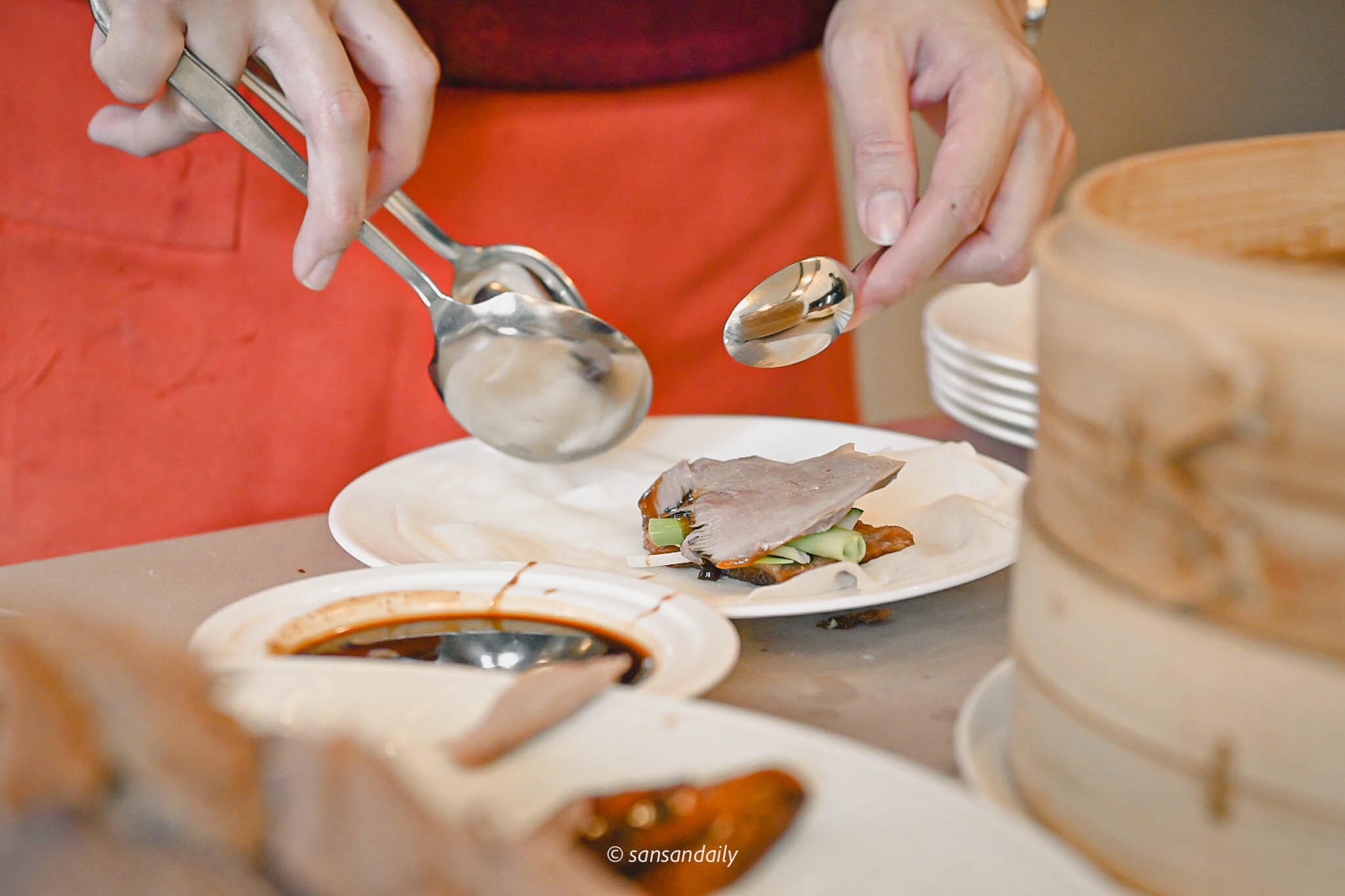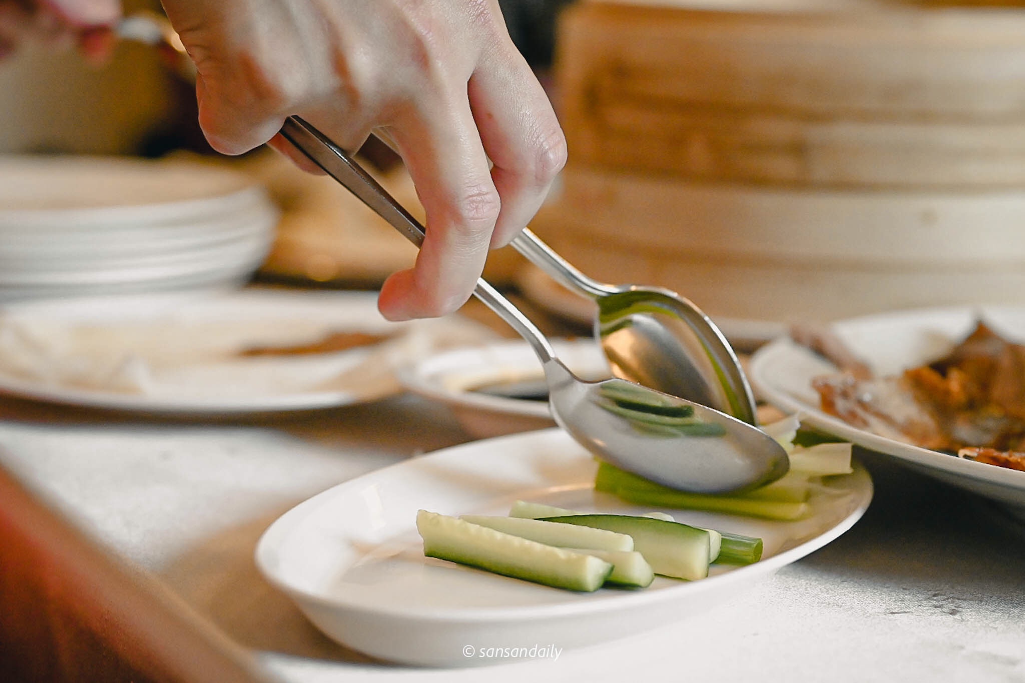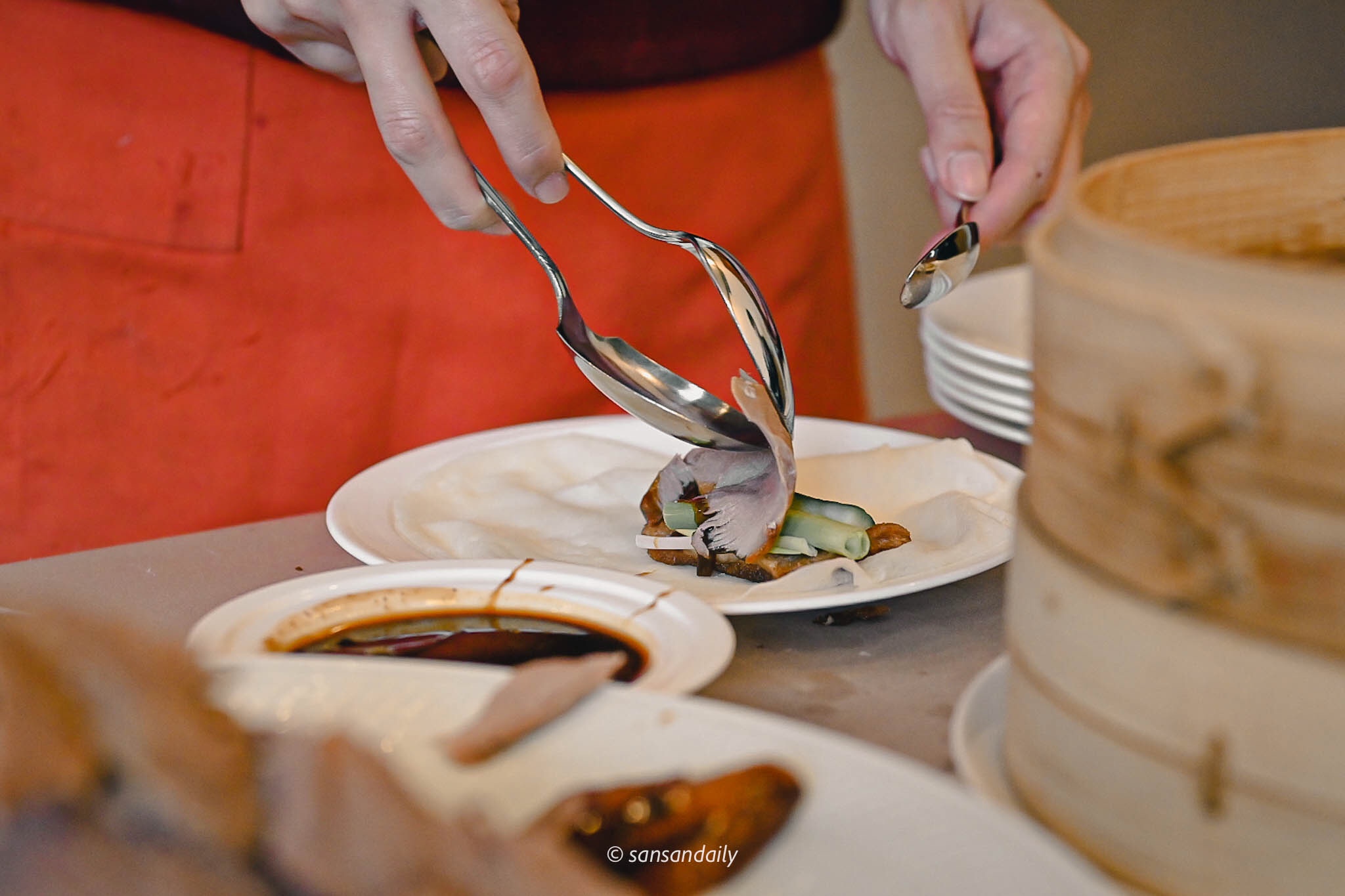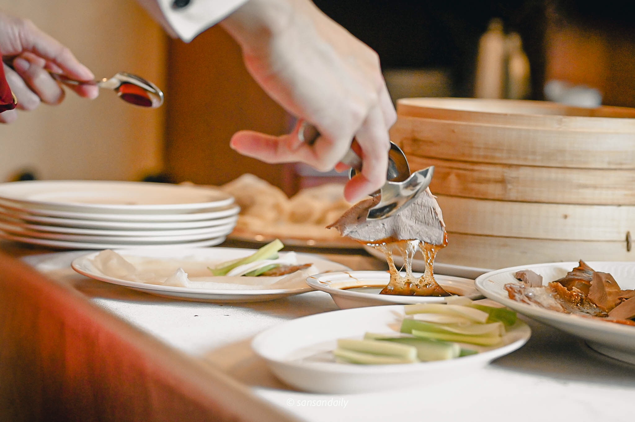 欣賞完主廚精湛的片鴨秀,服務員接著進行下一道桌邊料理秀「鴨肉捲餅」,手工Q彈餅皮中包入屏東小黃瓜、宜蘭三星蔥與沾上適量甜麵醬的宜蘭片皮烤鴨。